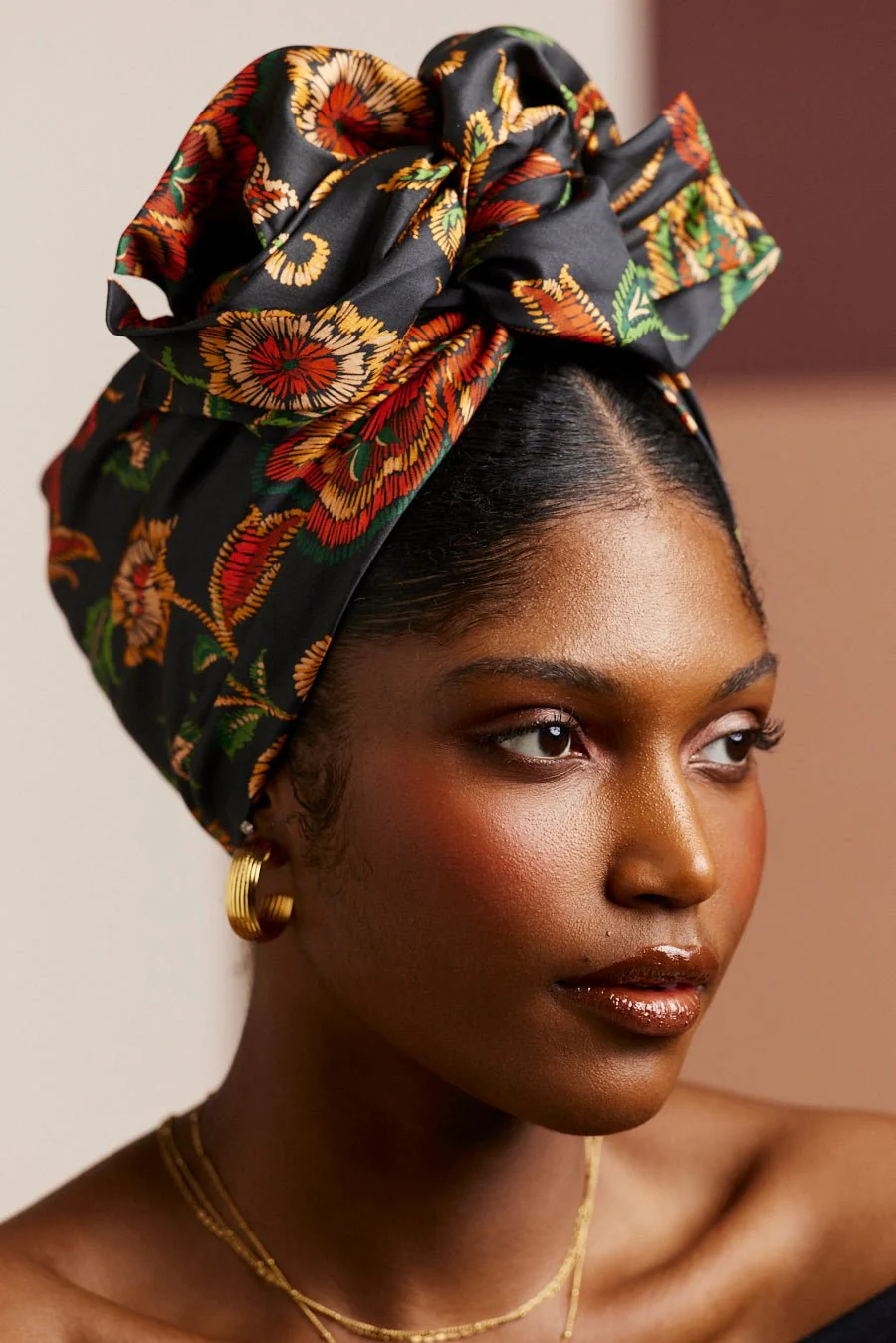 Porté avec volume, noué en fleur, il dégage un style plus exotique et se marie parfaitement avec des tons roses pour une association gaie et inattendue.