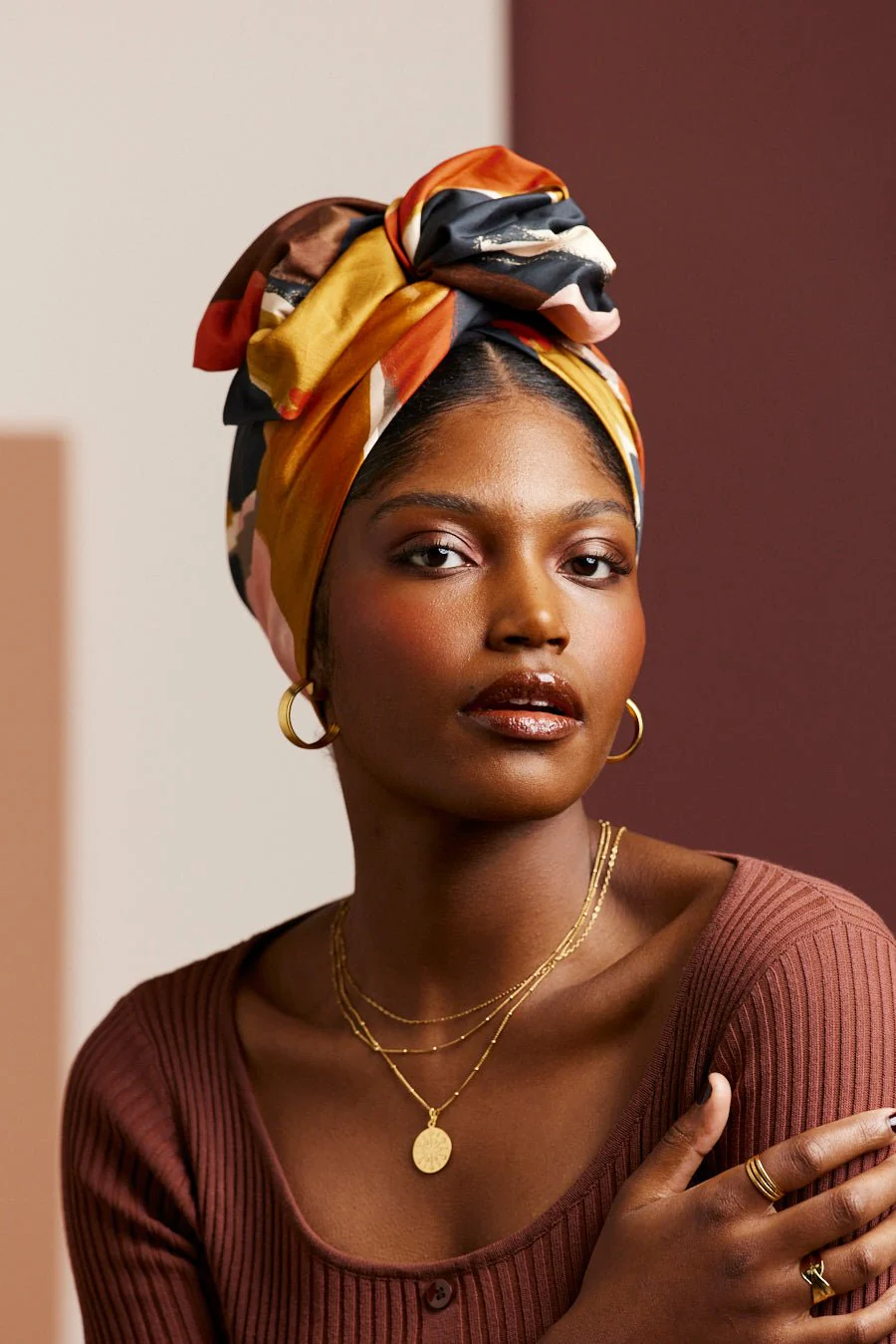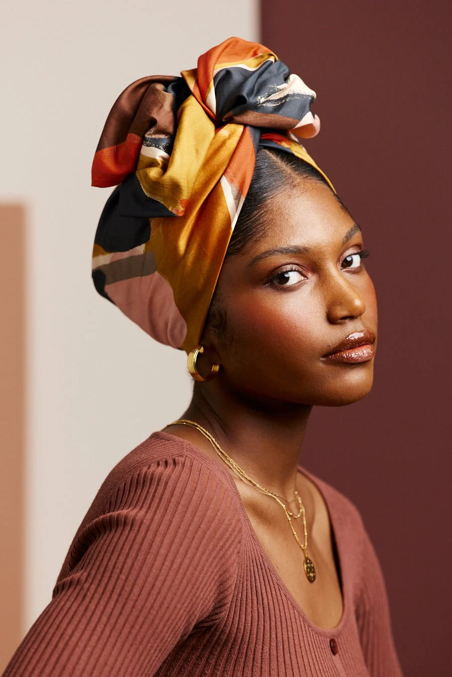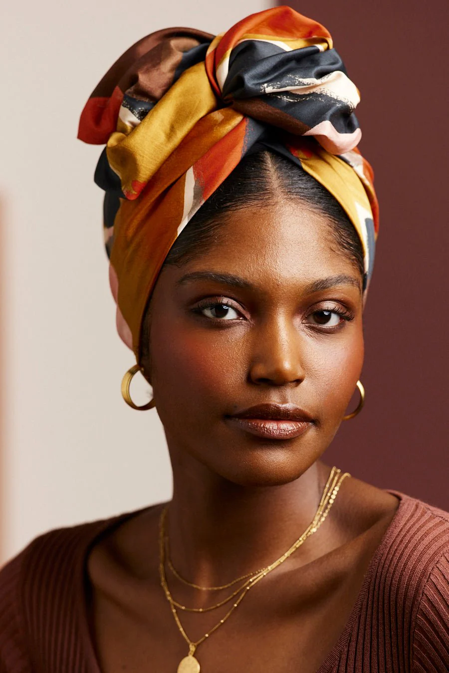 Turban complet à tige métallique motif abstrait noir marron jaune et orange