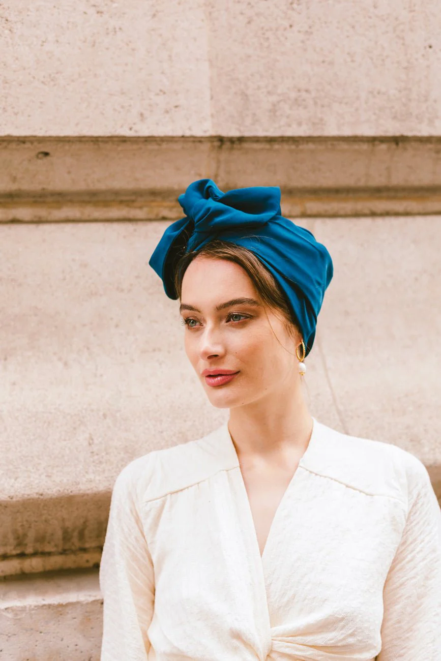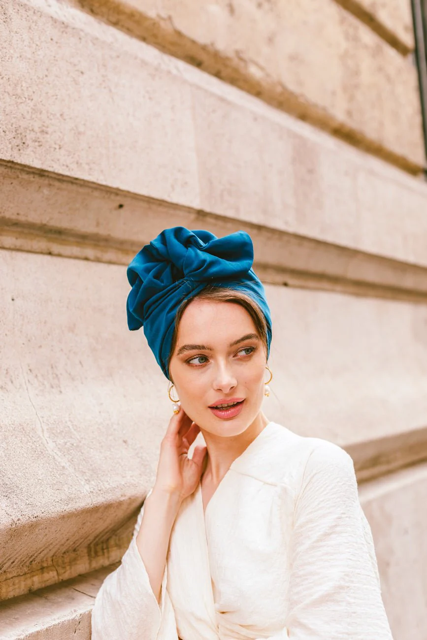 Avec sa couleur bleu canard profond, ce turban prêt à enfiler est un véritable atout pour ajouter une touche de sophistication et d’audace à votre tenue. Son coloris intense rehausse votre look tout en restant élégant.