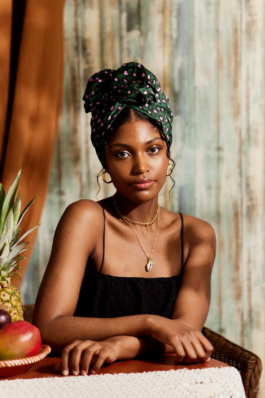 Avec ses couleurs audacieuses vert profond et rose poudré, ce turban revisite le motif léopard avec un twist moderne et fun ! Son nouage classique au style rétro en fait une pièce incontournable à avoir dans sa garde robe.