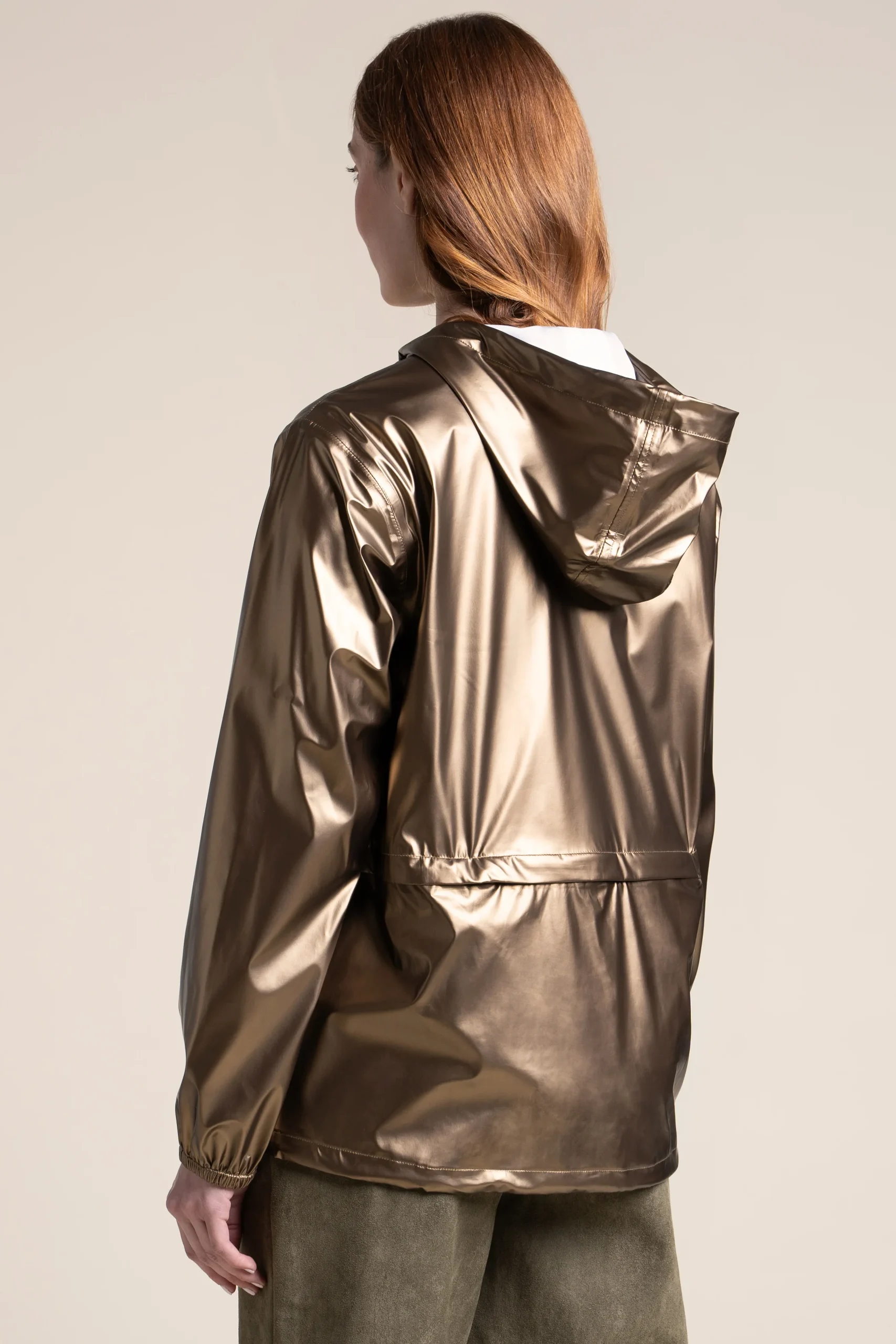 Imperméable court métallique et citadin. Léger, respirant et conçu en tissu recyclé, il allie style, confort et technicité.