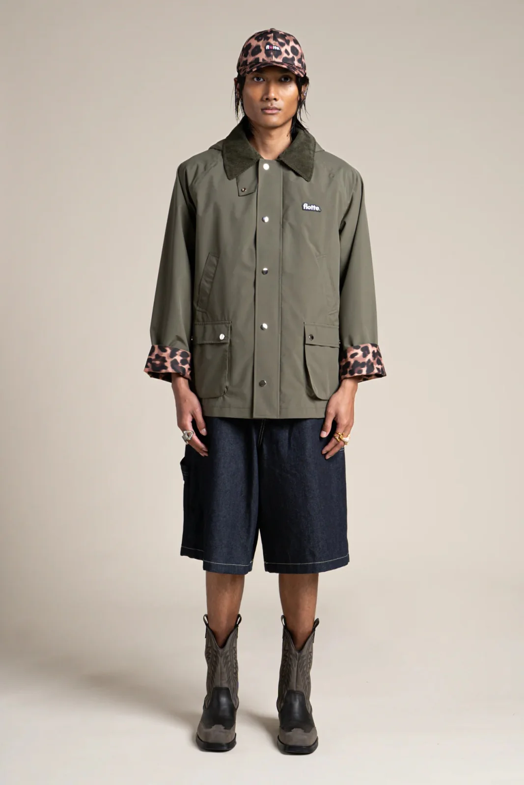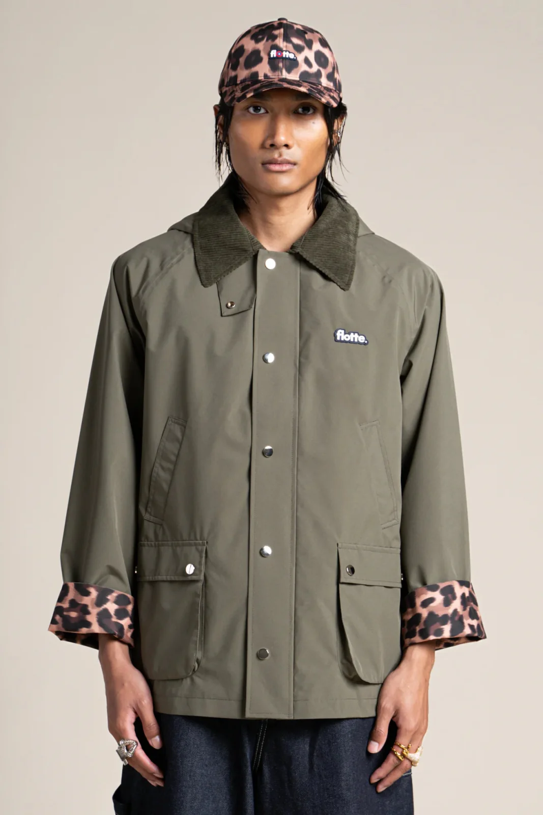 Inspirée de la veste de chasse. Imperméable et coupe-vent. Tissu en polyester recyclé, respirant et léger. Col et manches contrastés. Capuche amovible.