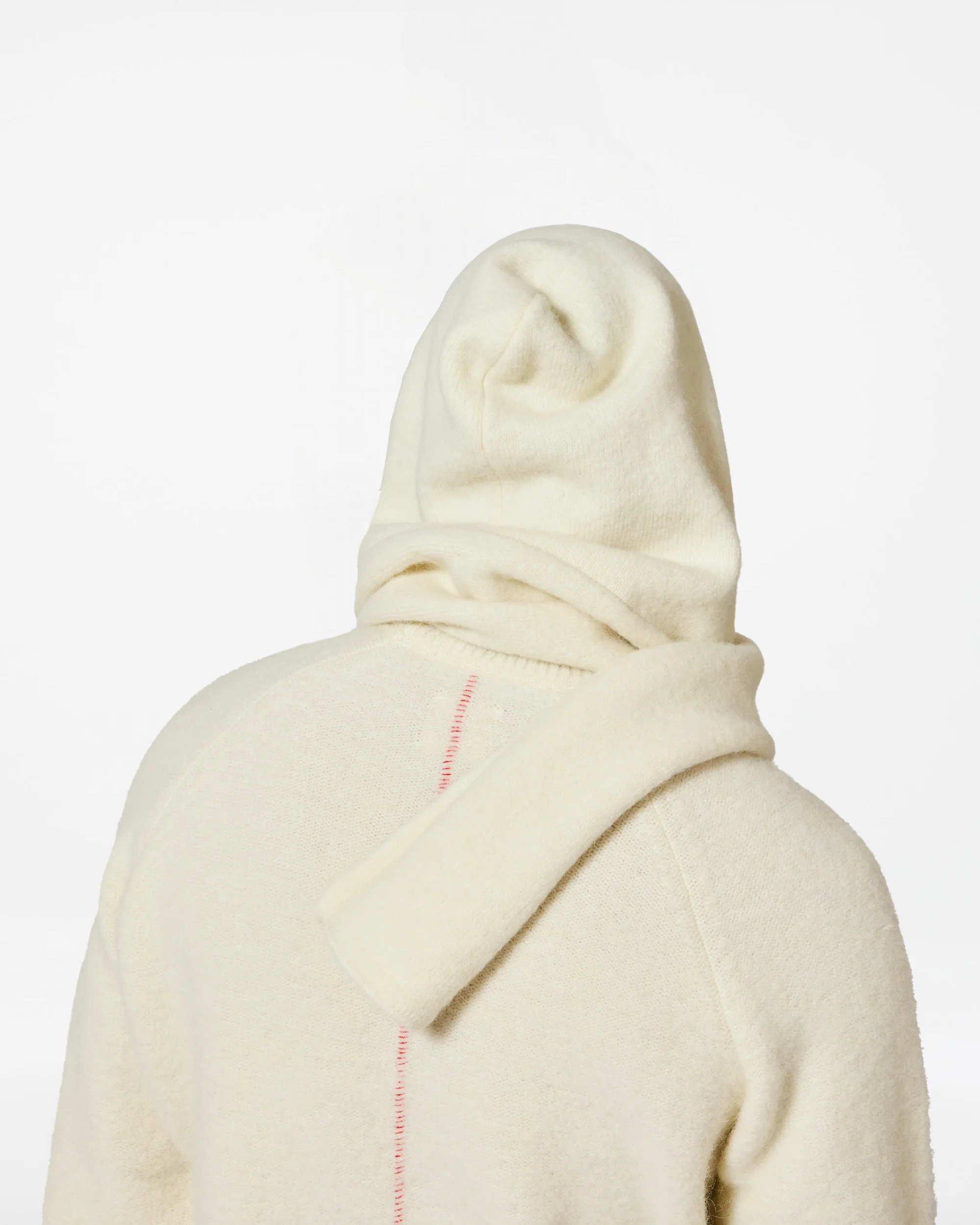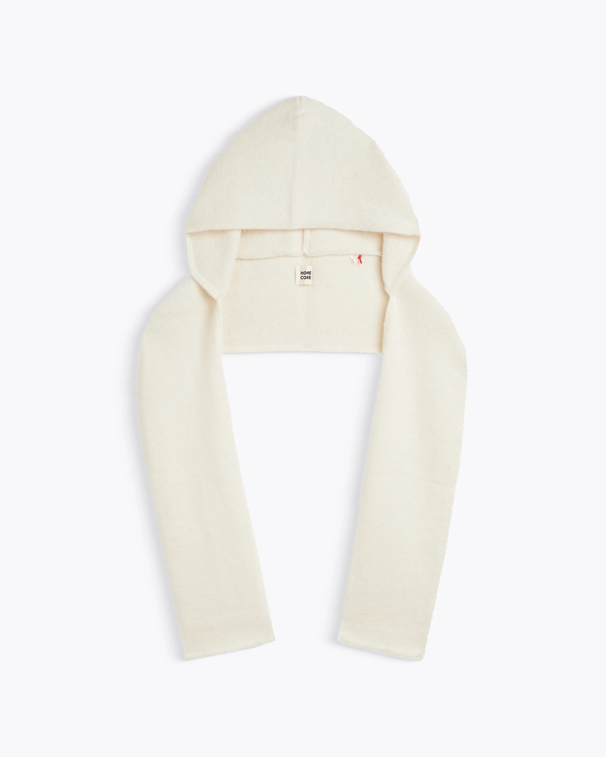 Capuche tricotée crème avec écharpe intégrée.