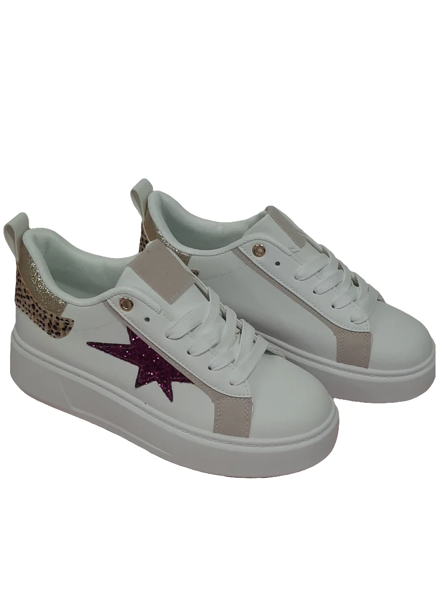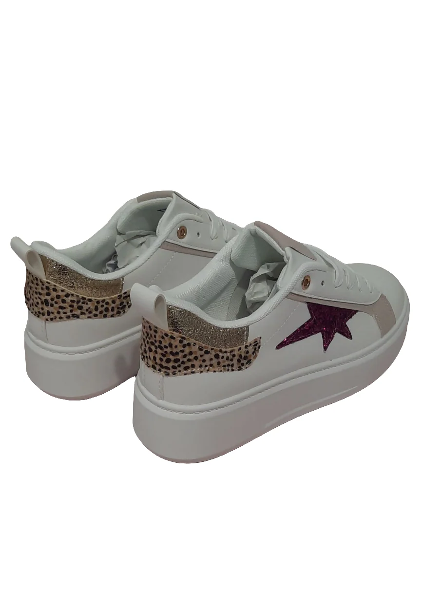 Baskets Femme Blanches Étoile Pailletée Fuchsia & Détail Léopard