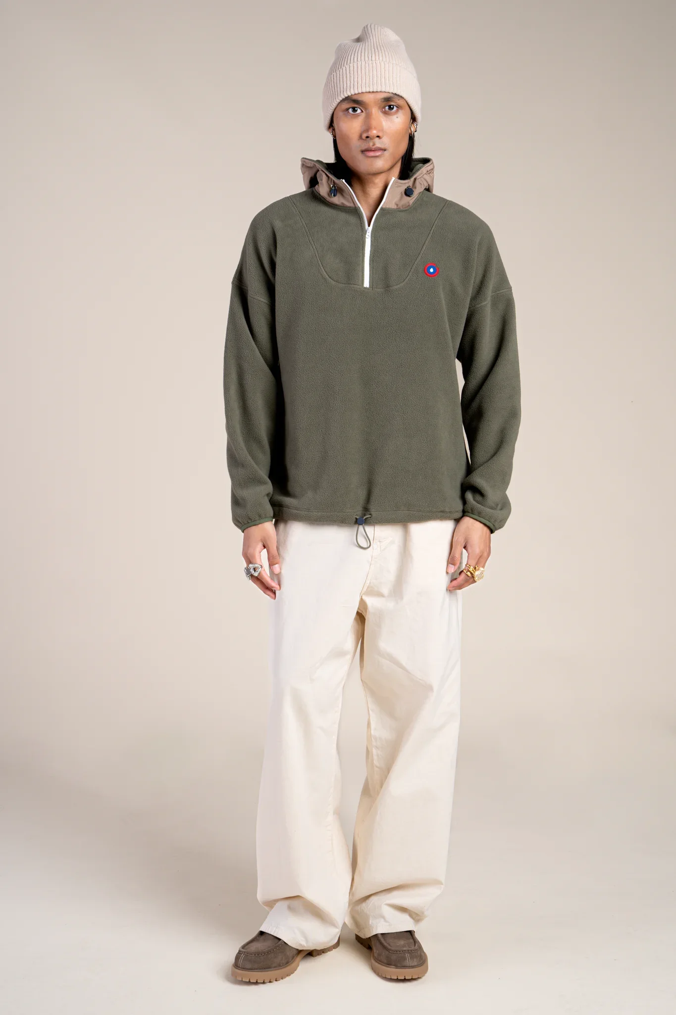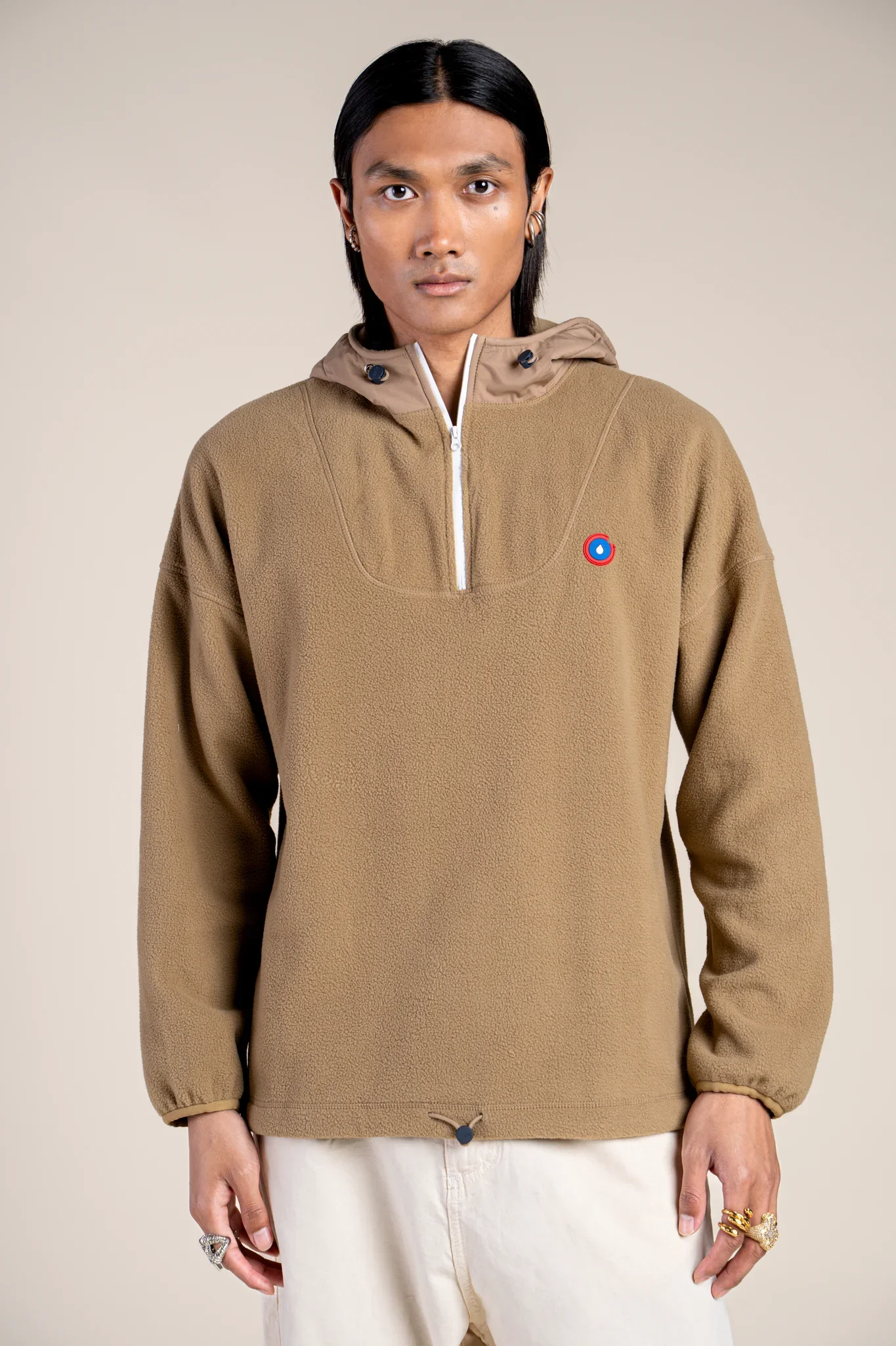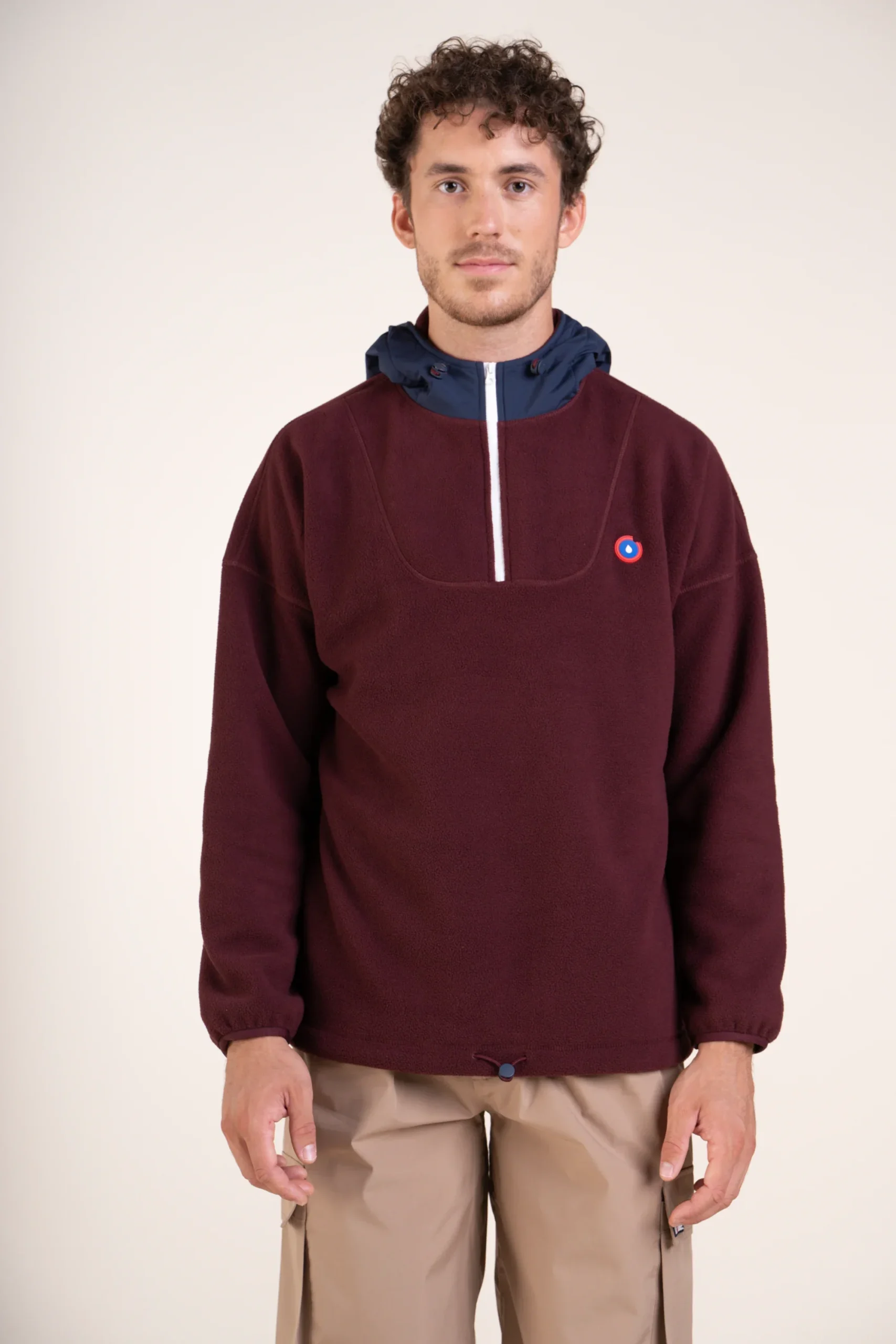 Un sweat en polaire recyclé. Ultra-chaud et confortable. Capuche en tissu imperméable.