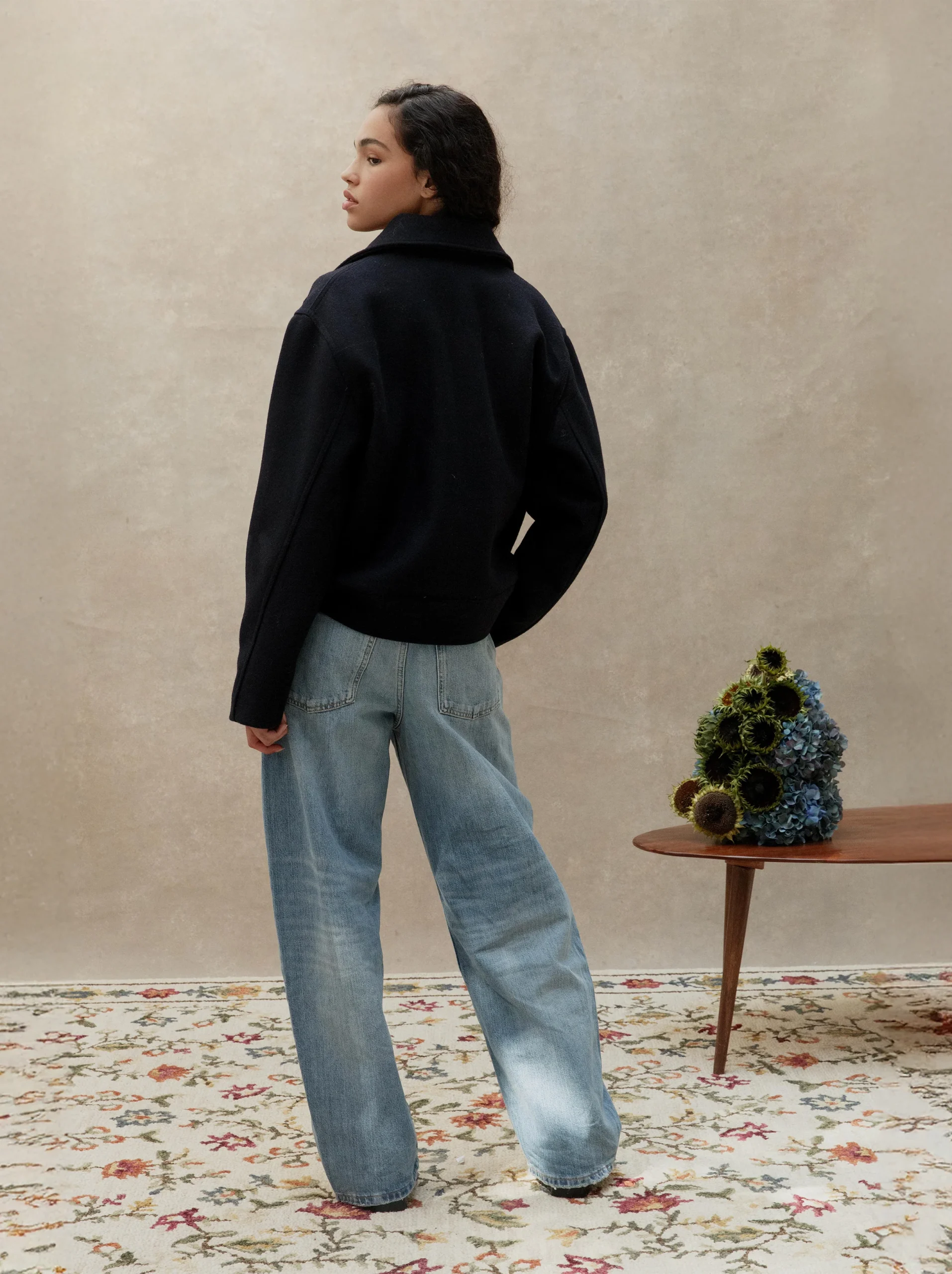Blouson en drap de laine confectionné à partir d’un tissu sourcé dans un stock d’exception situé à Paris et engagé dans l’économie circulaire. Chaque détail reflète l’unicité et l’authenticité de cette pièce appartenant à une série limitée.