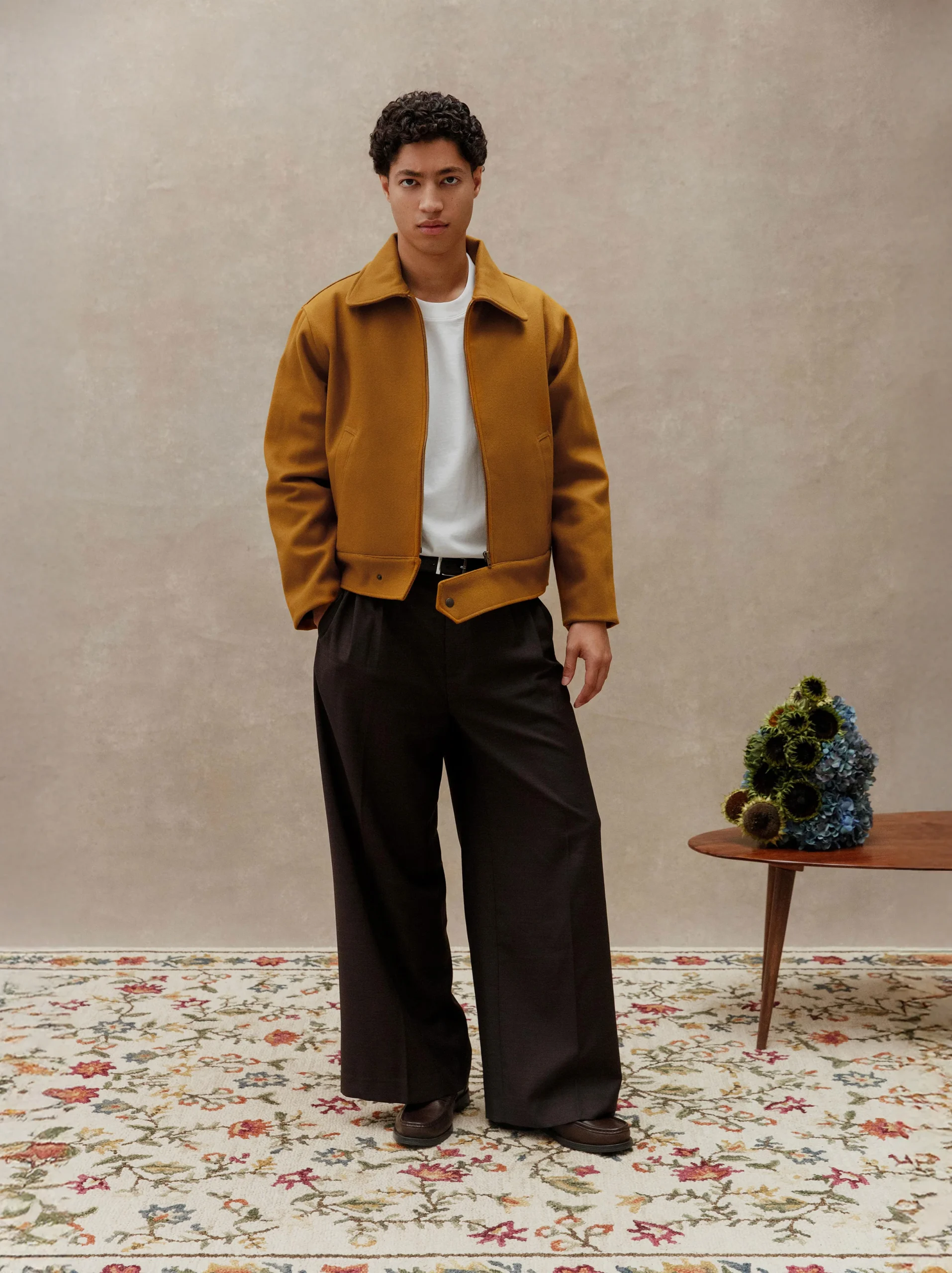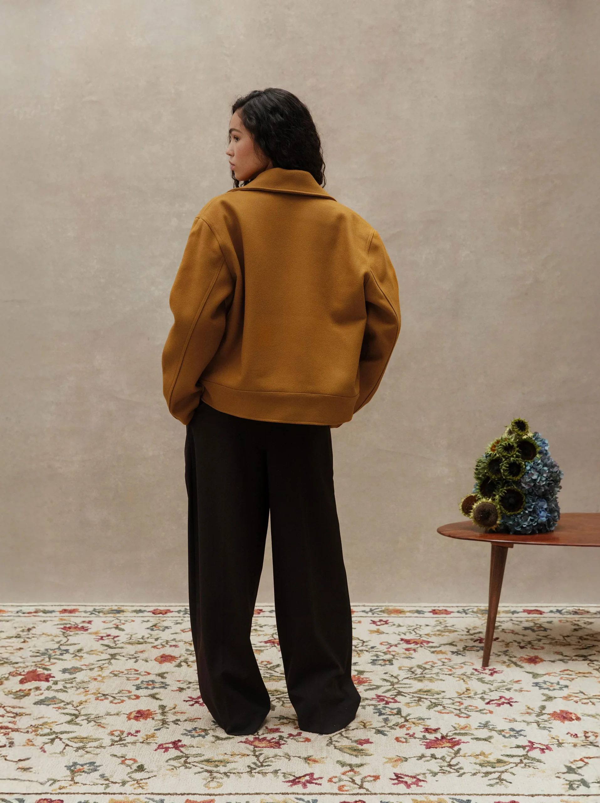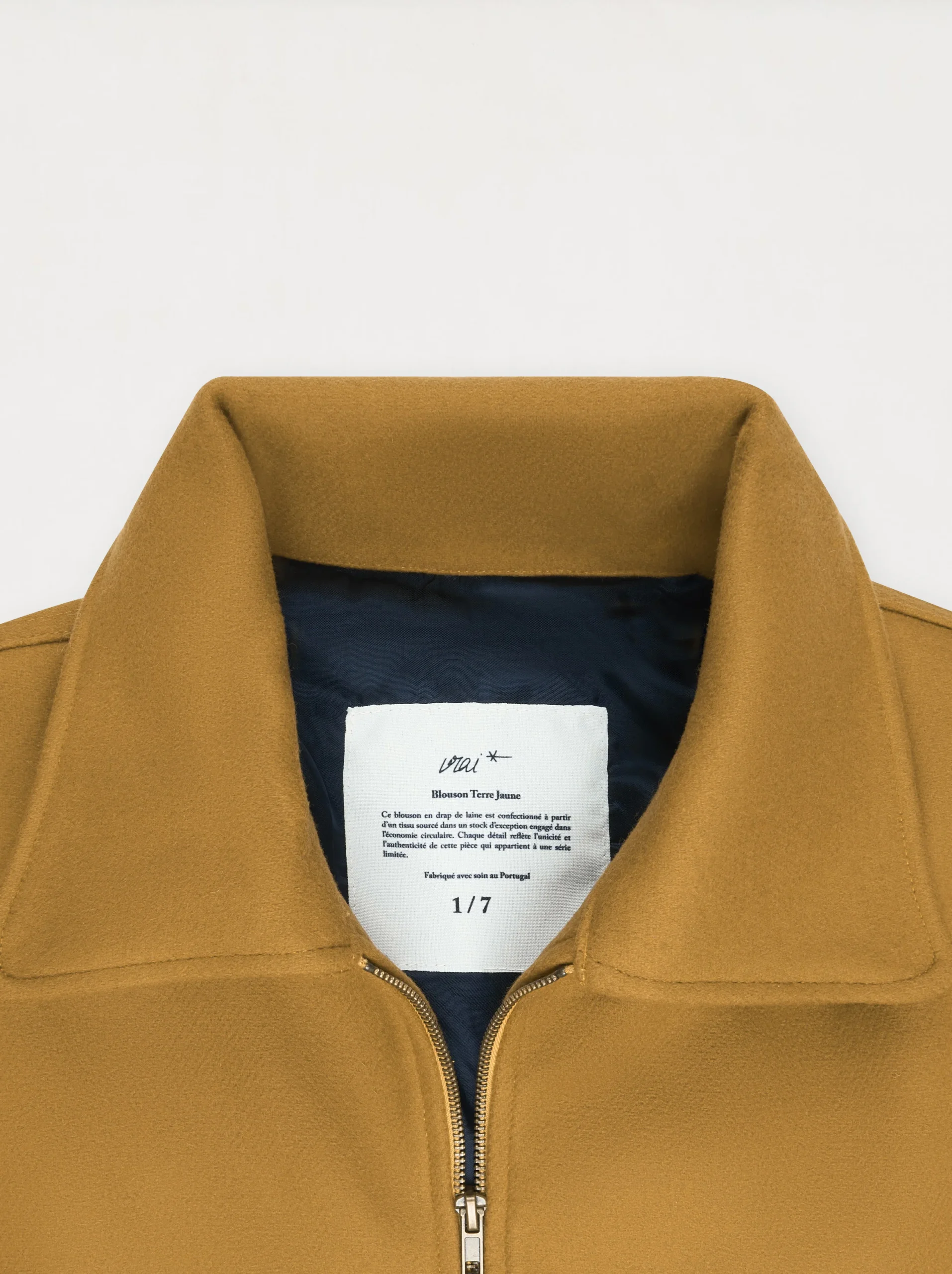 Blouson en drap de laine confectionné à partir d’un tissu sourcé dans un stock d’exception situé à Paris et engagé dans l’économie circulaire. Chaque détail reflète l’unicité et l’authenticité de cette pièce appartenant à une série limitée.