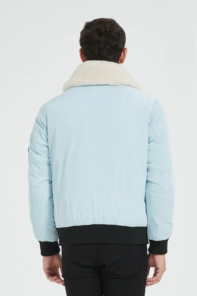 Bomber style aviateur. Coupe courte ajustée à la taille. Large col américain fourré blanc. Fermeture à glissière en métal. Poche plaquée décorative sur l’épaule. 2 poches zippées sur les côtés. Doublure matelassée avec une poche intérieur.