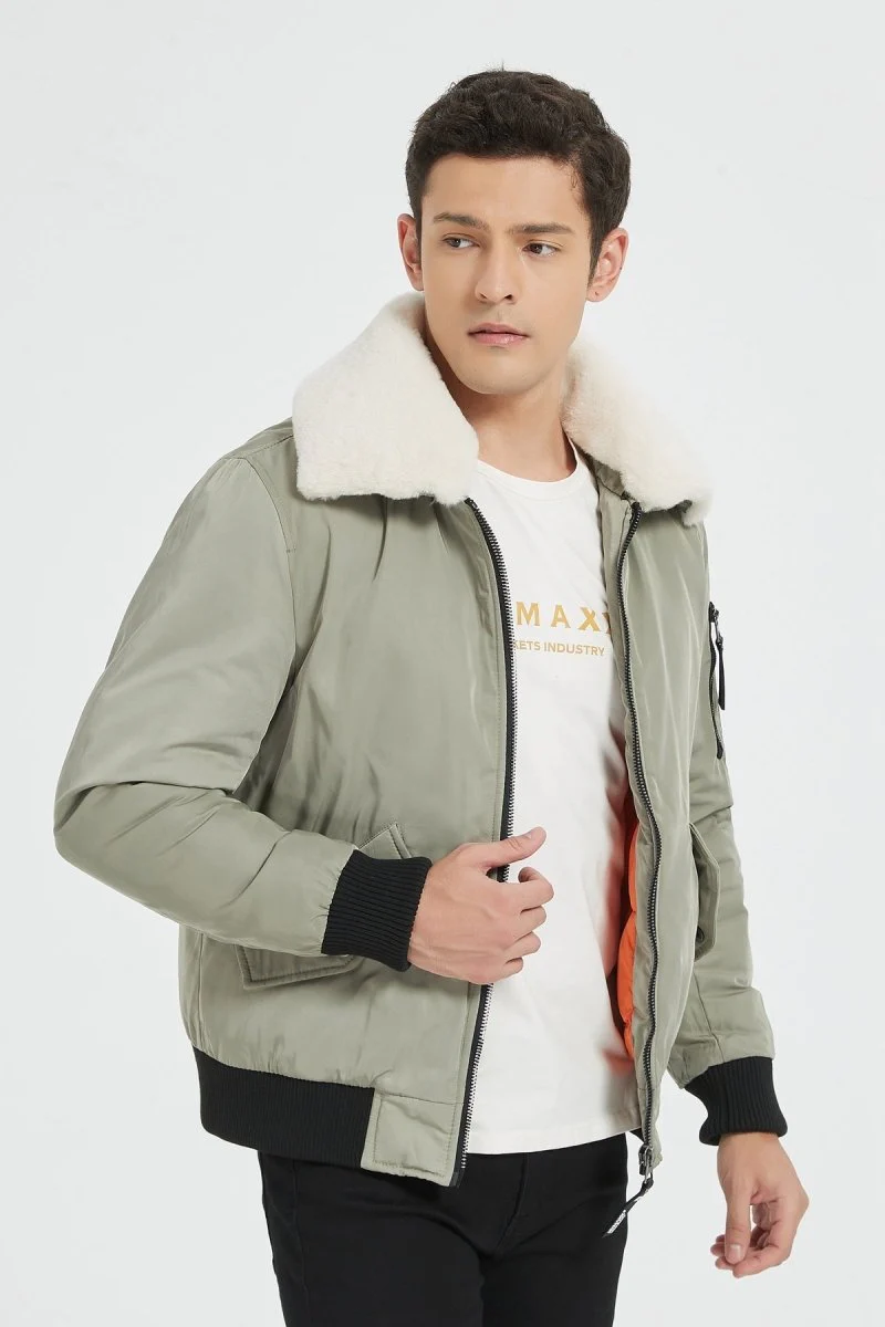 Bomber style aviateur. Coupe courte ajustée à la taille. Large col américain fourré blanc. Fermeture à glissière en métal. Poche plaquée décorative sur l’épaule. 2 poches zippées sur les côtés. Doublure matelassée avec une poche intérieur.