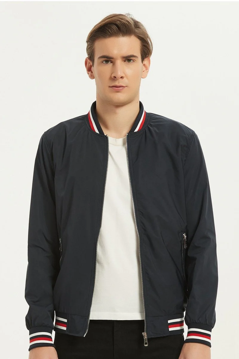 Coupe courte ajustée. Matière déperlante. Petit col Teddy tricolore. Élastiques taille et poignets assortis. Poche zippée sur le bras. Fermeture à glissière en métal. Deux poches zippées sur les côtés. Doublure contrastée avec une poche intérieure. Blouson mi-saison homme.