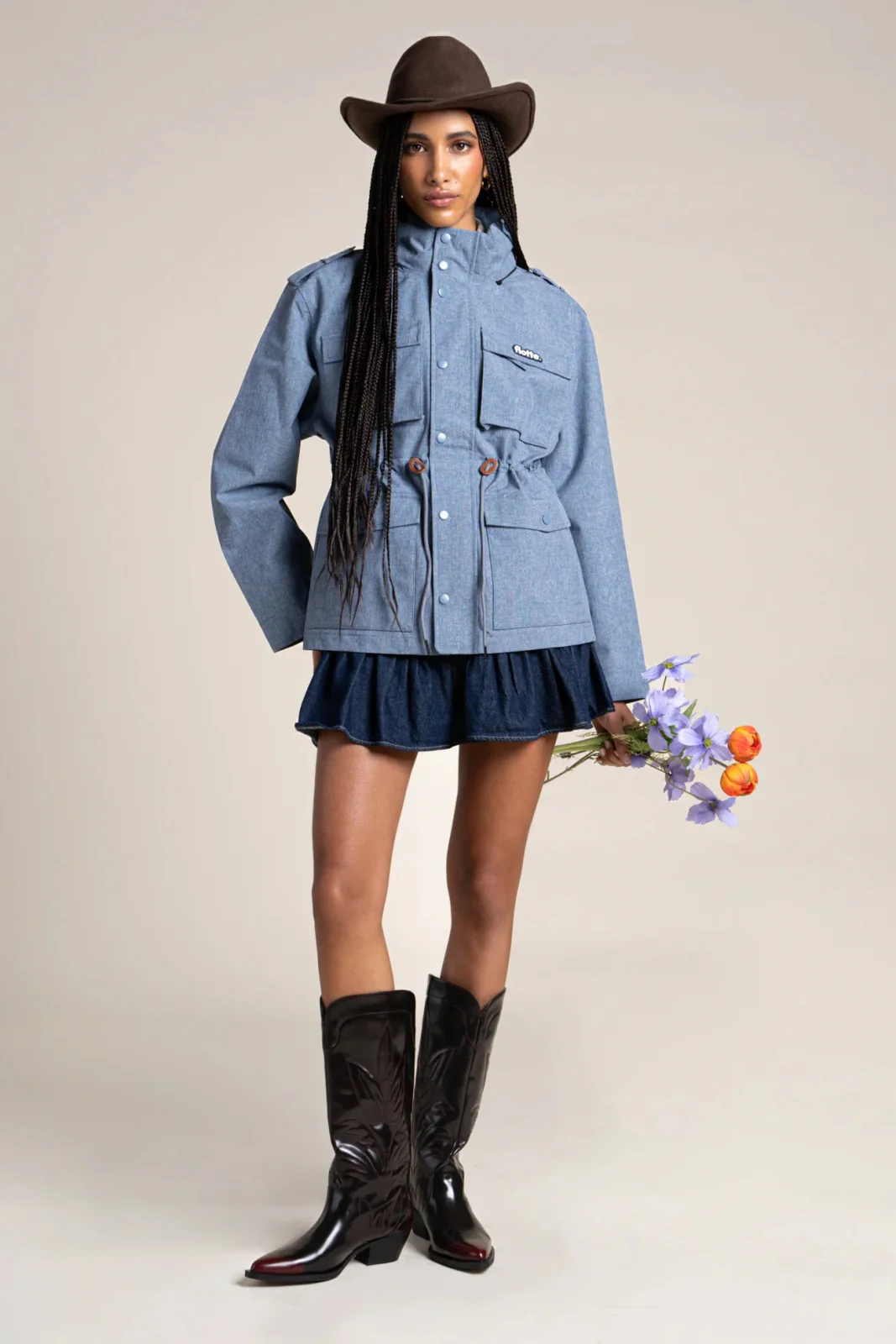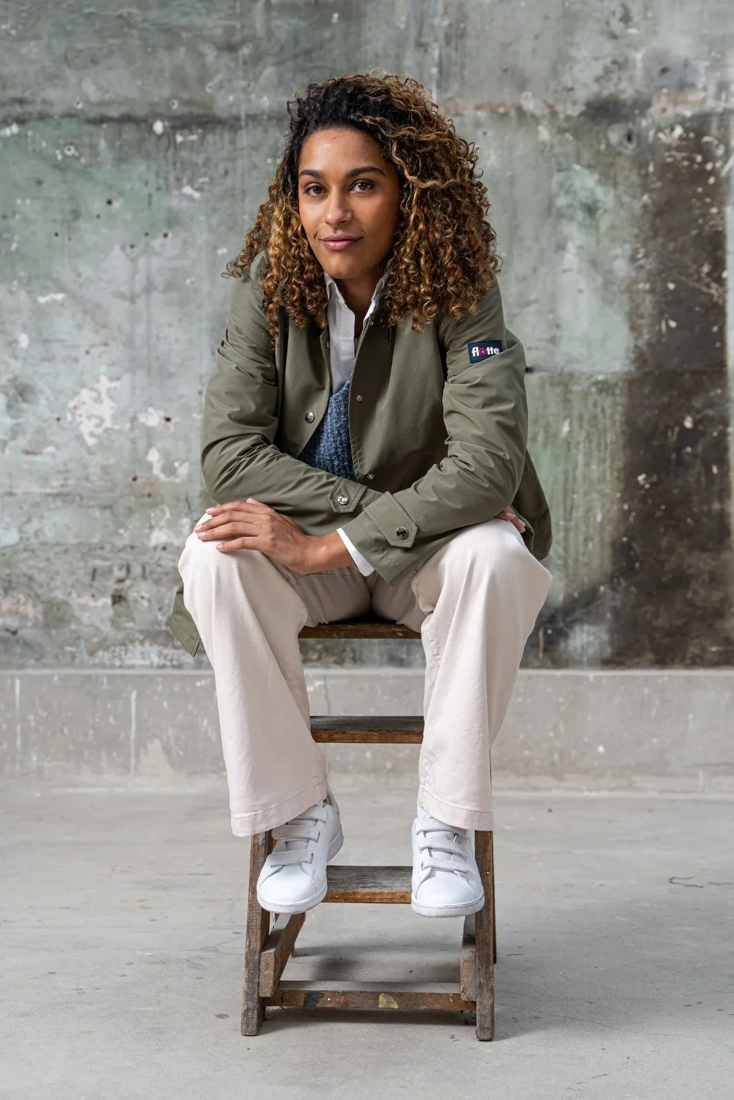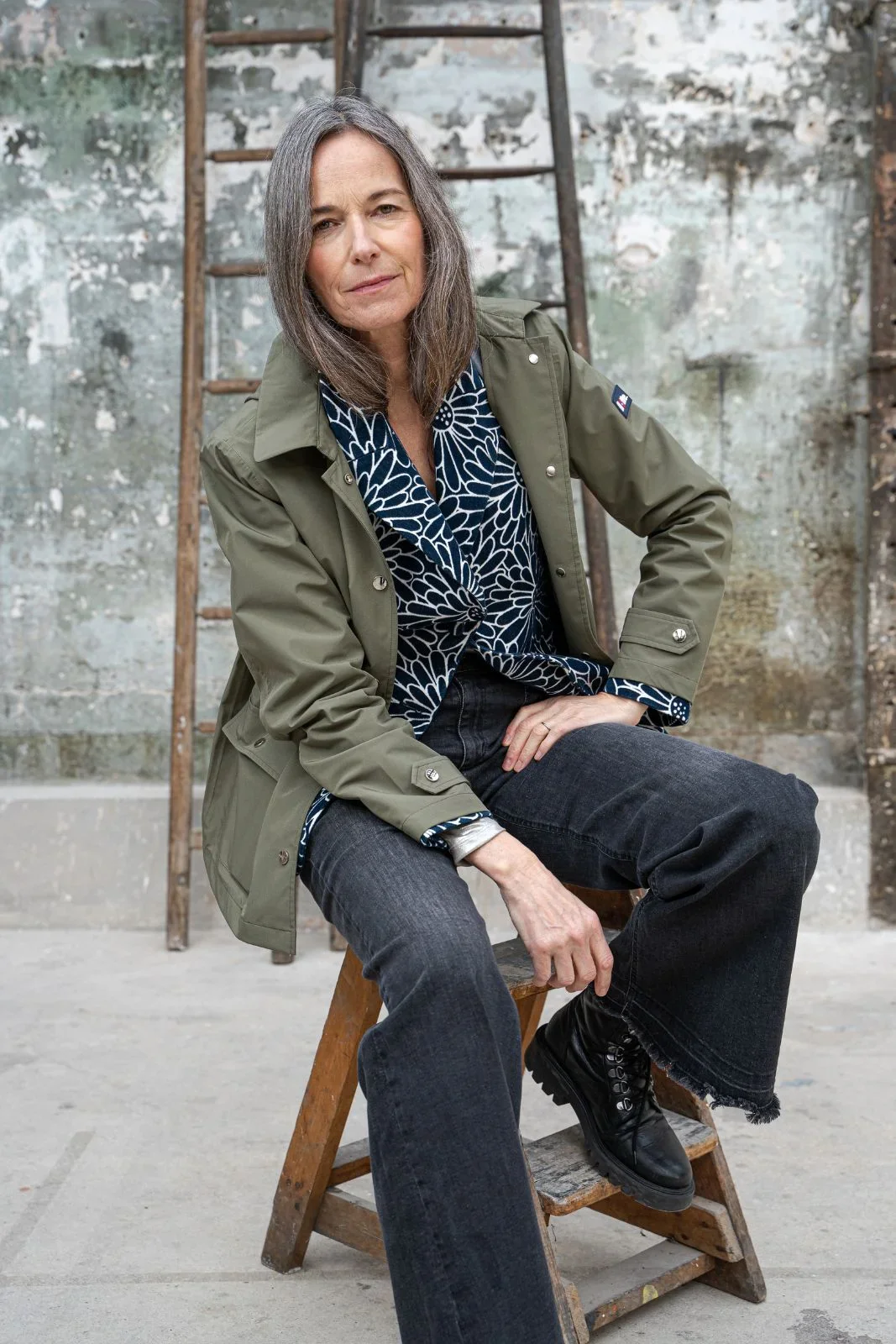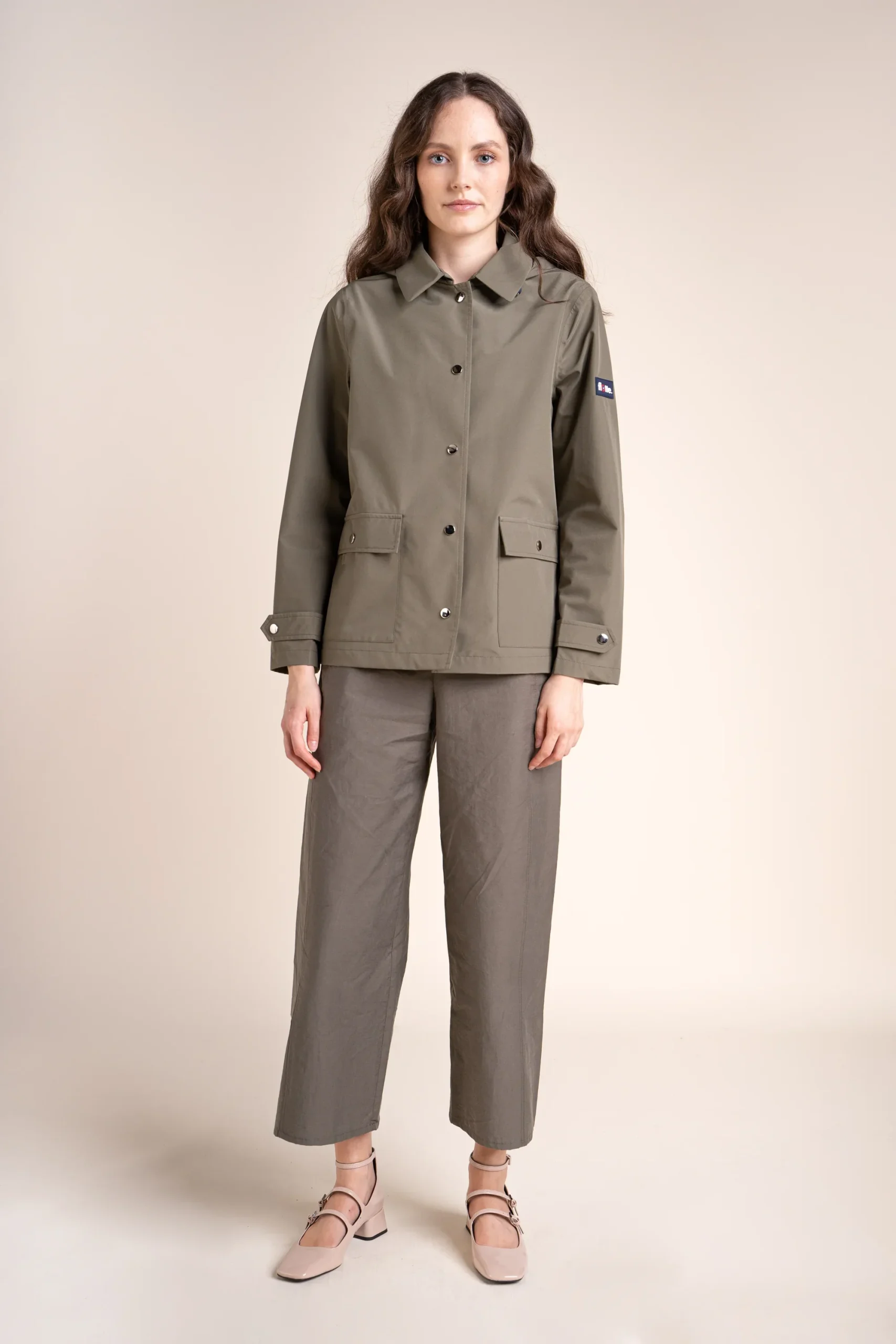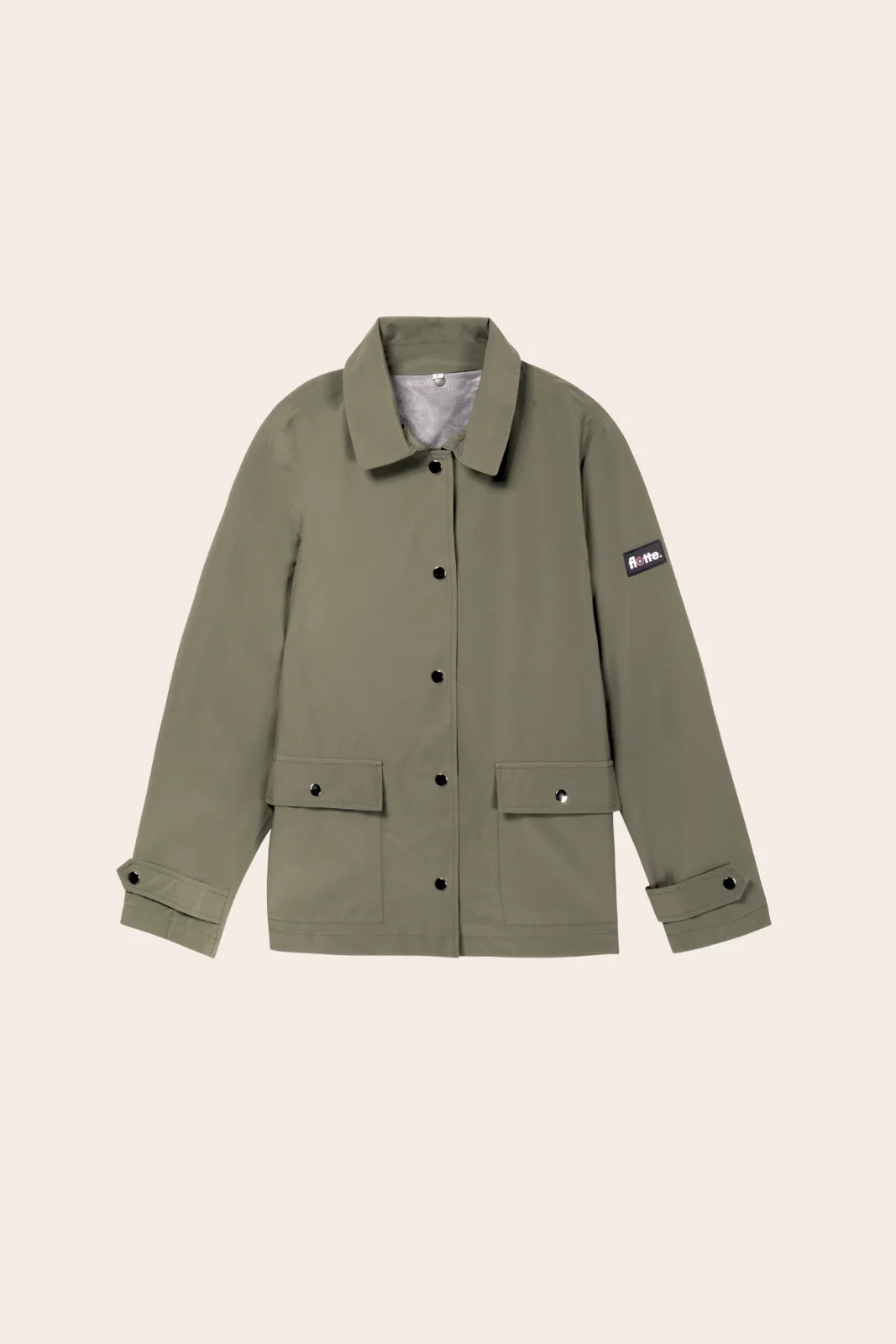 Une veste imperméable Made in France en tissu technique recyclé de 3 couches. Inspirée de la célèbre veste de travail. Coupe droite, légère, capuche amovible.
