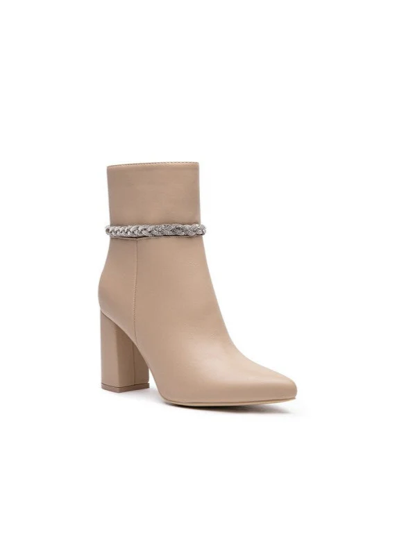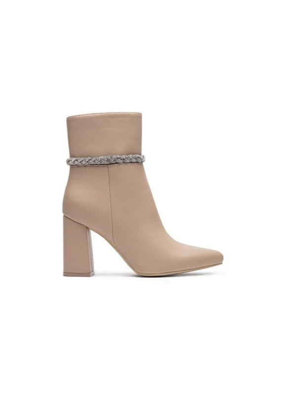 Bottines Beige Femme – Chaîne Strass & Talon Carré Élégant