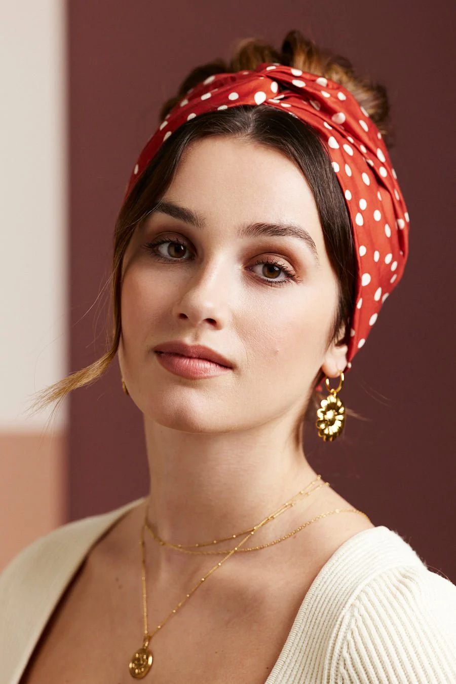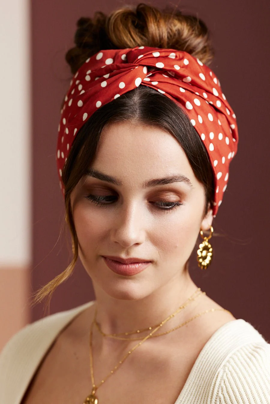 BANDEAU CHEVEUX PRET À ENFILER Motif à pois blanc fond terracotta