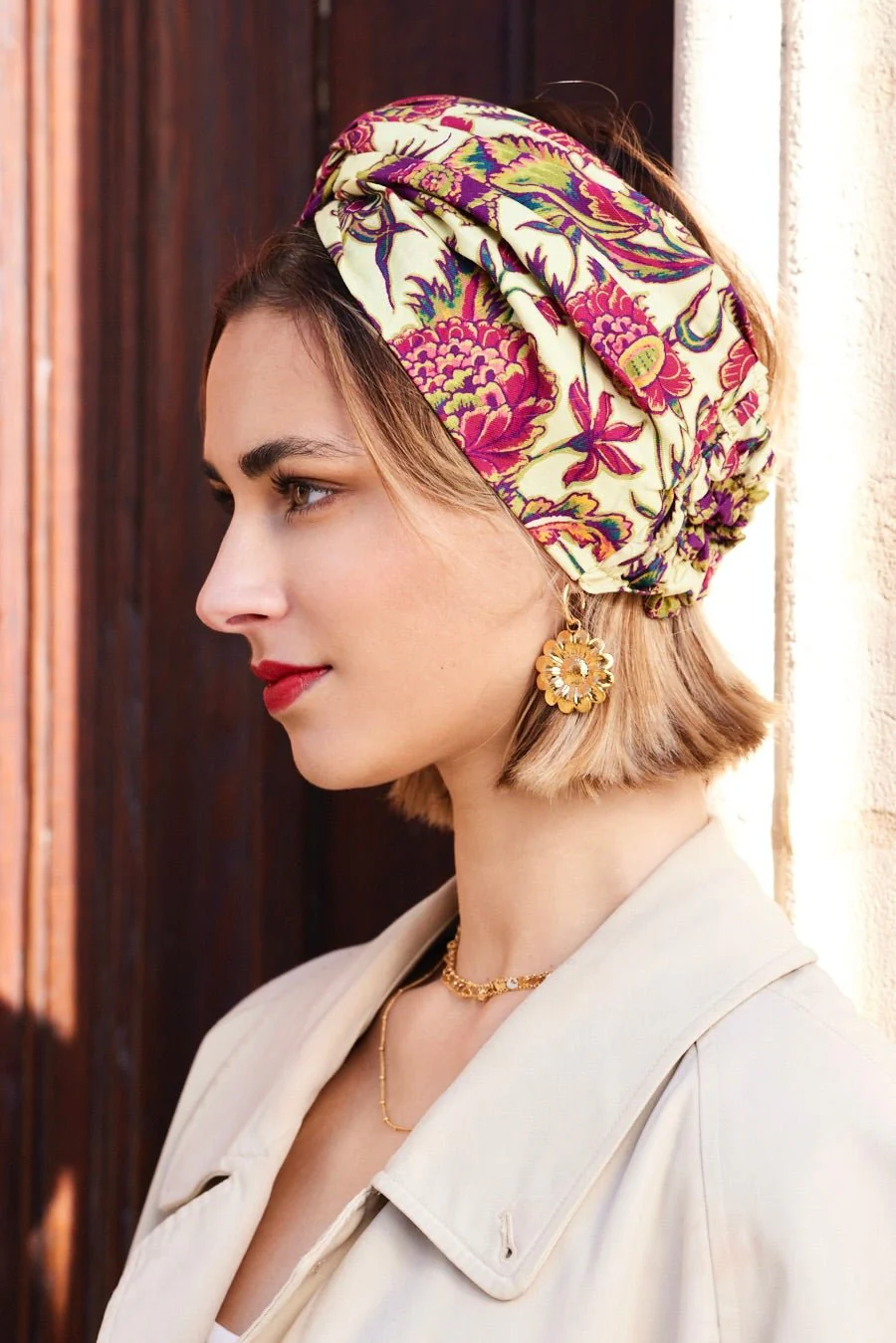 BANDEAU CHEVEUX PRET À ENFILER imprimé fleurs marron fond écru