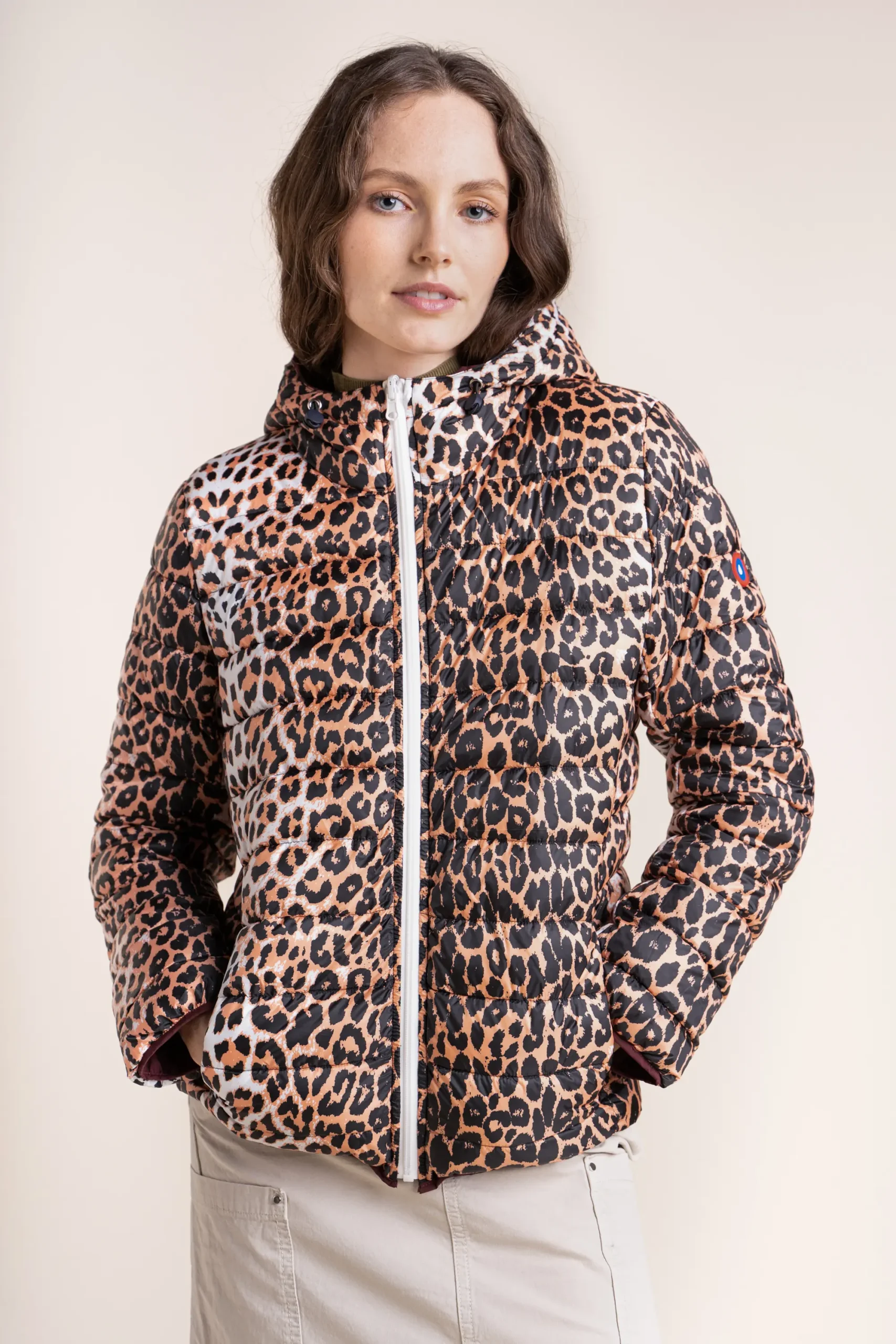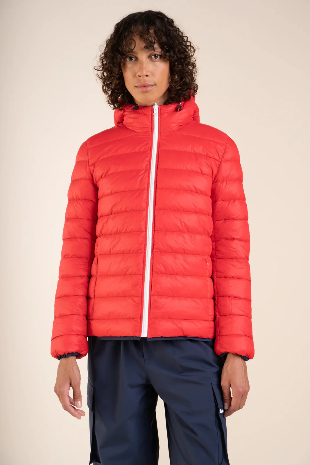 Une doudoune réversible et courte. Côté lisse et imperméable en tissu recyclé. Côté chaud et matelassé, rembourrée d’un duvet d’origine végétale Dupont Sorona.