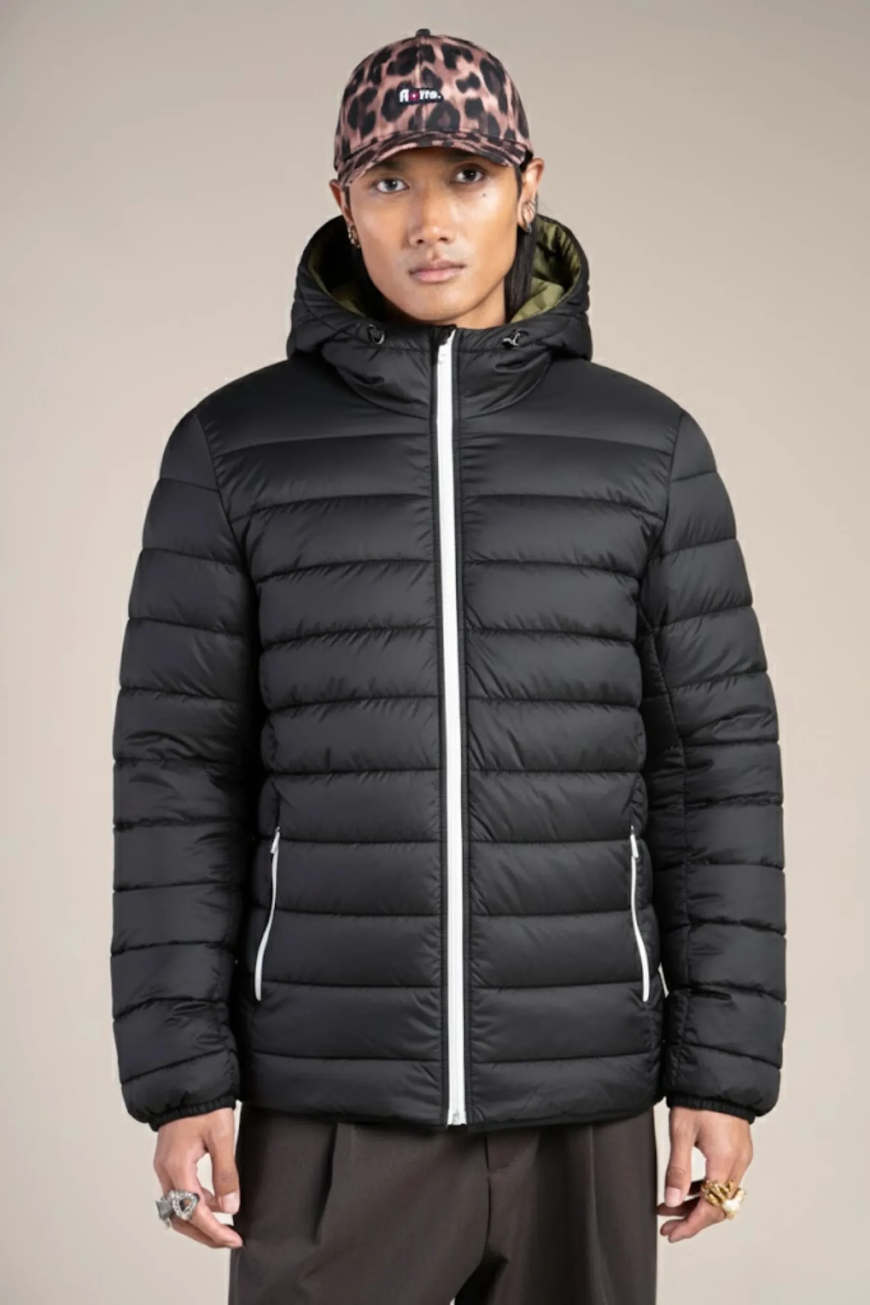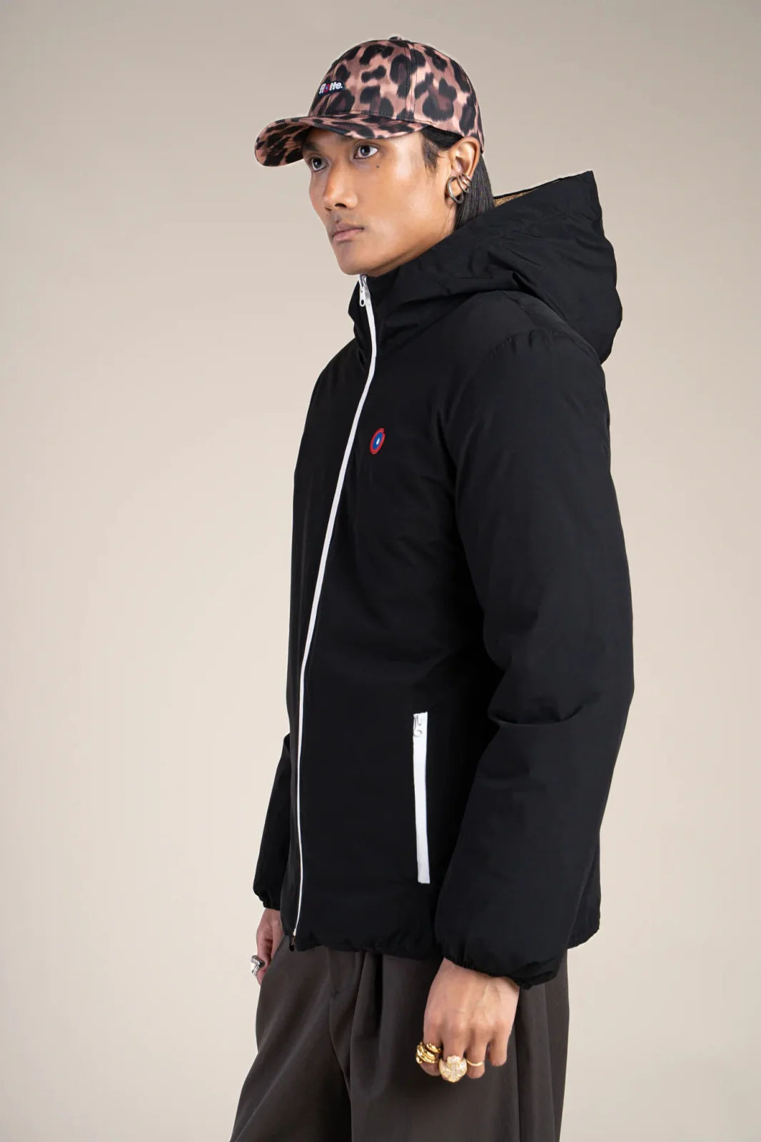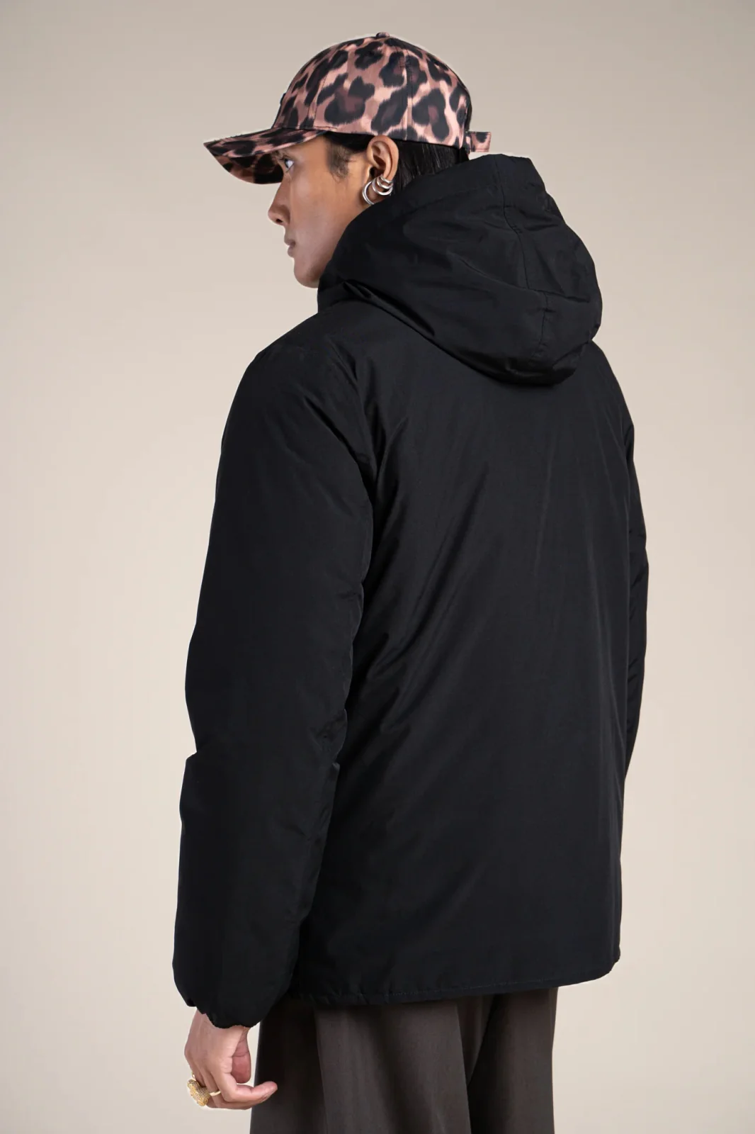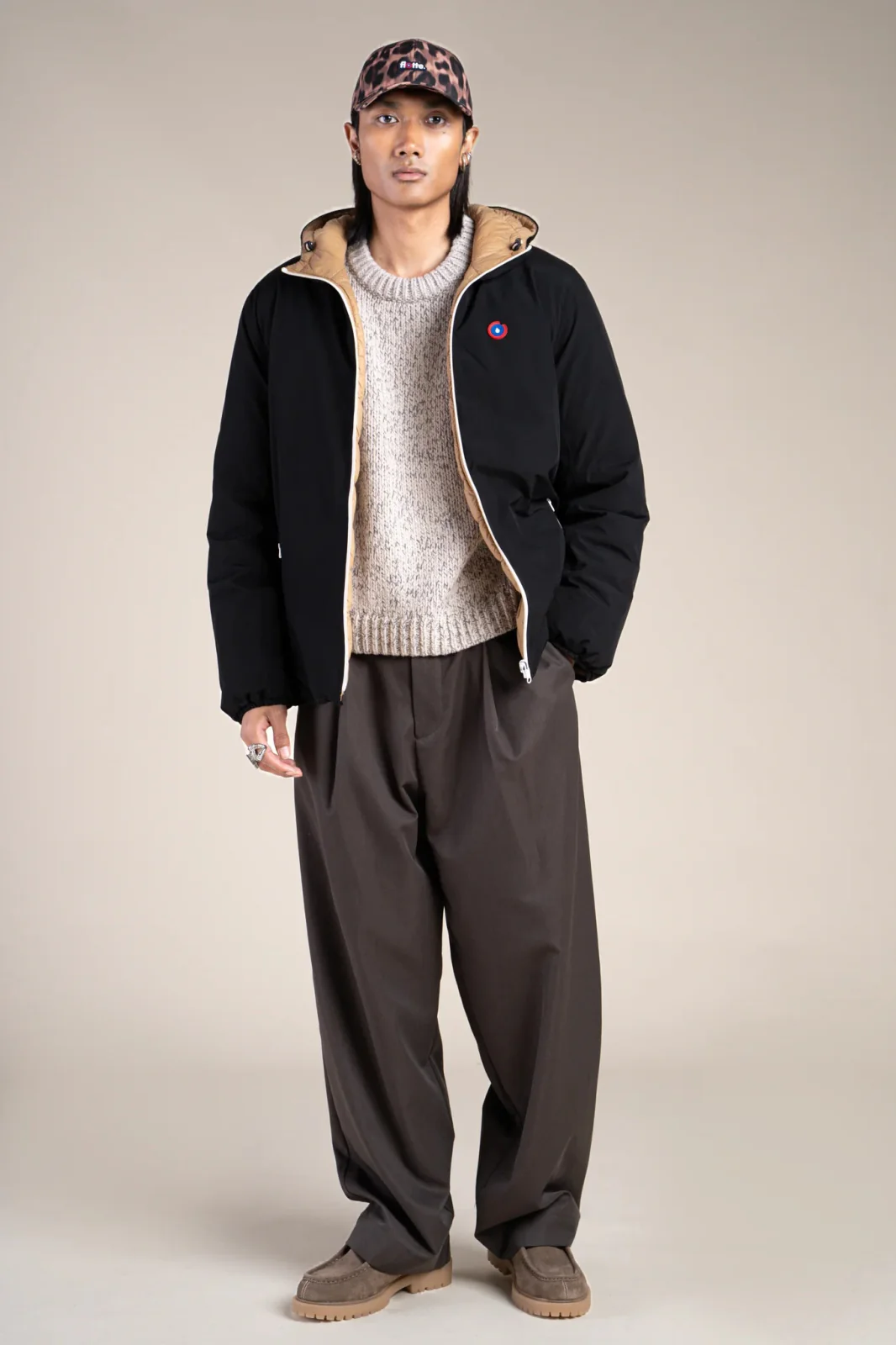Une doudoune réversible et courte. Côté lisse et imperméable en tissu recyclé. Côté chaud et matelassé, rembourrée d’un duvet d’origine végétale Dupont Sorona.