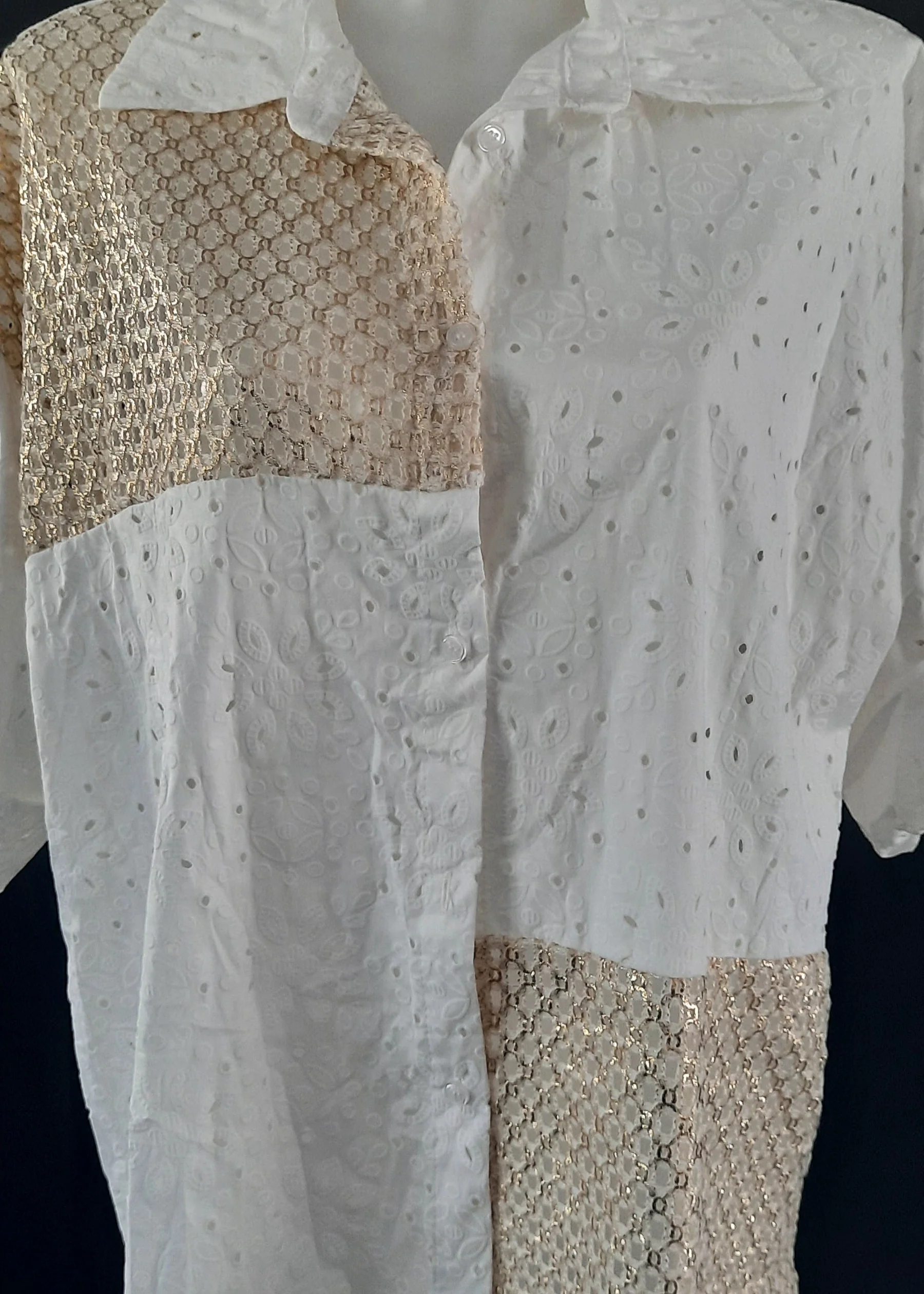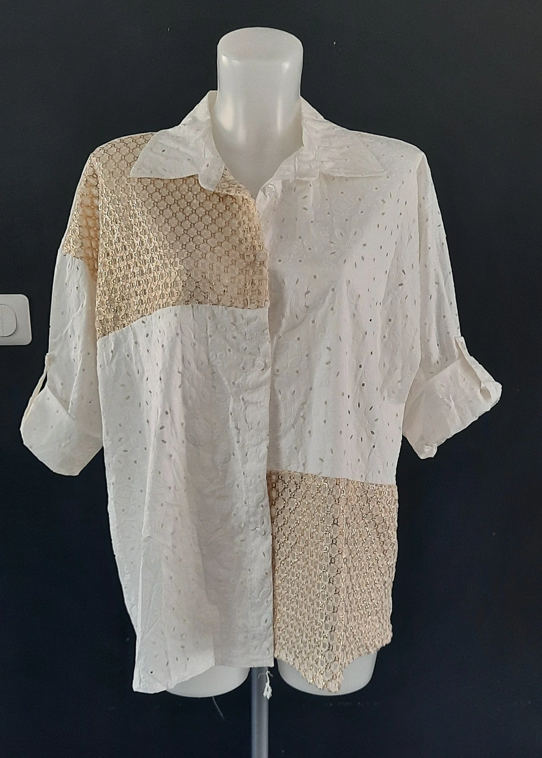 Cette chemise originale allie le charme de la broderie anglaise blanche à la chaleur du crochet beige doré pour un style résolument bohème chic.