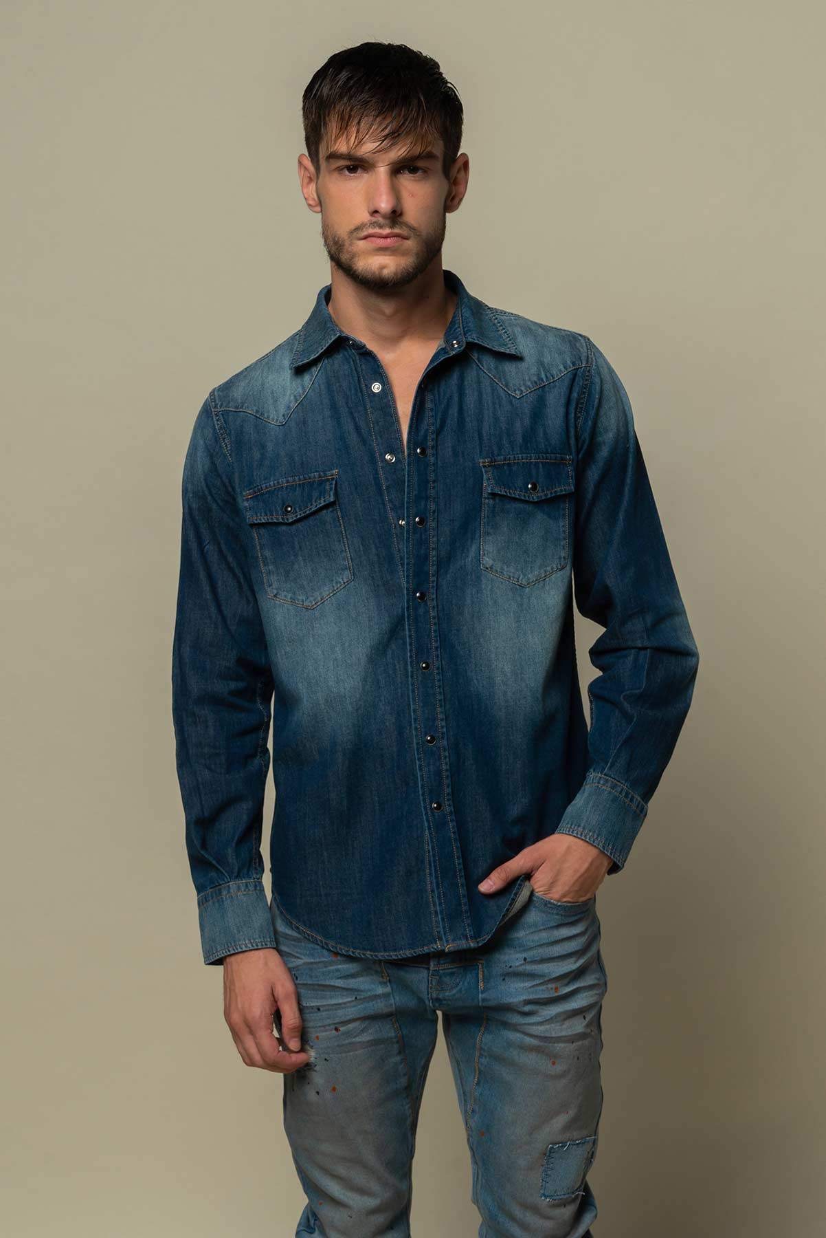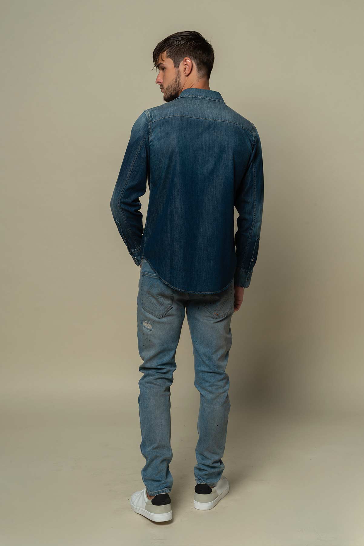 Cette chemise en Jean Denim bleu foncé à la coupe parfaitement ajustée sera un essentiel de choix dans votre garde-robe. D’un bleu jean soutenu, son délavage léger sur les coudes, les épaules et le ventre en font un item chic mais cependant facilement accordable avec votre garde-robe, pour tous les jours et pour les sorties.
