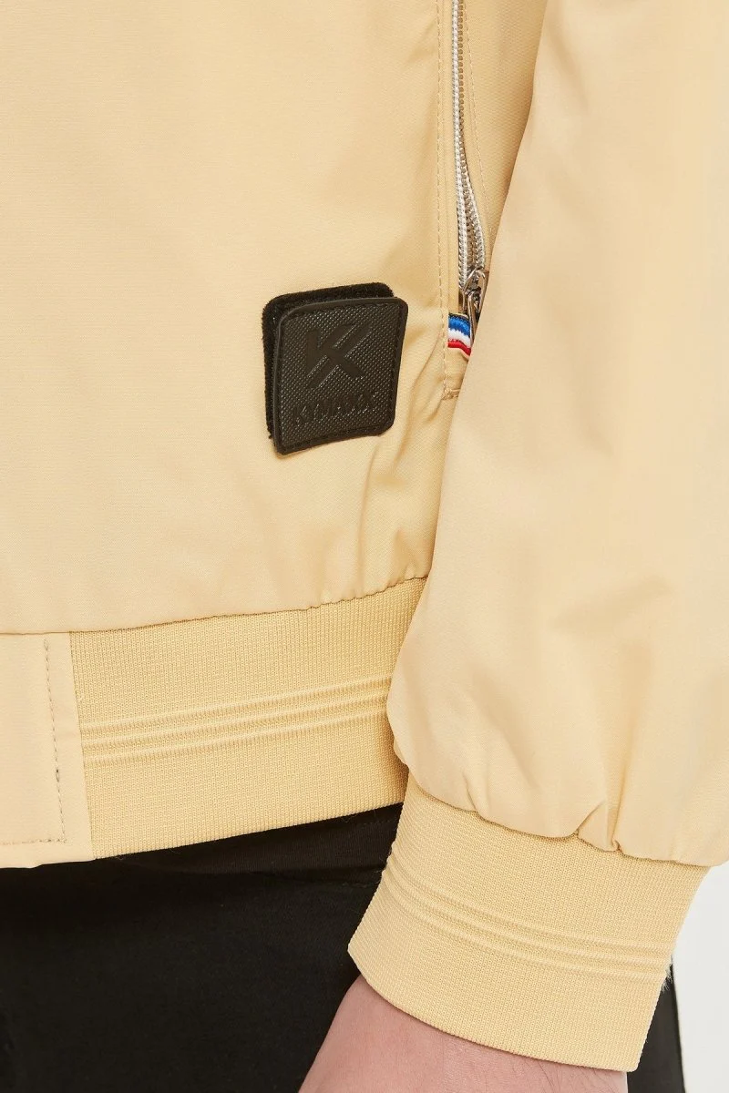 Veste mi-saison légère, fermeture avec zip argenté, col montant sans capuche, poches à fermeture éclair sur les côtés, bande tricolore sur le col et les poches, tissu de serrage avec relief de plis sur les poignets et le bas, doublure simple avec une poche intérieure, logotype Kymaxx en bas à gauche amovible par scratch.