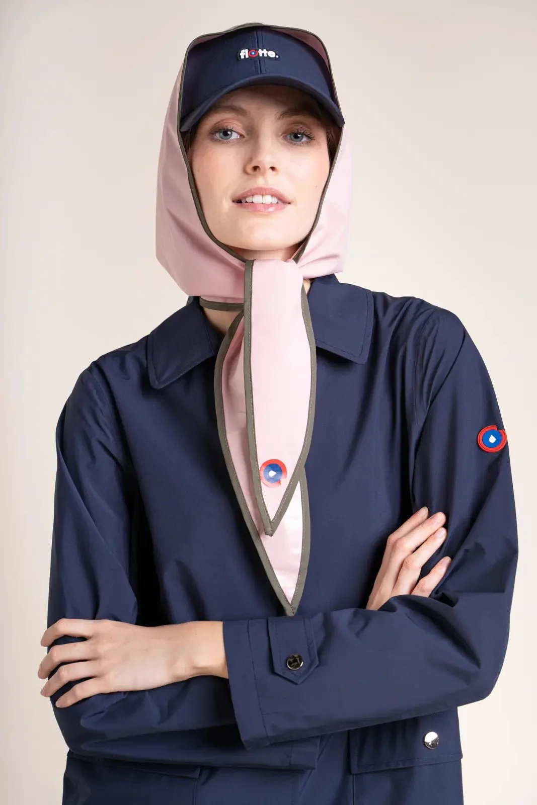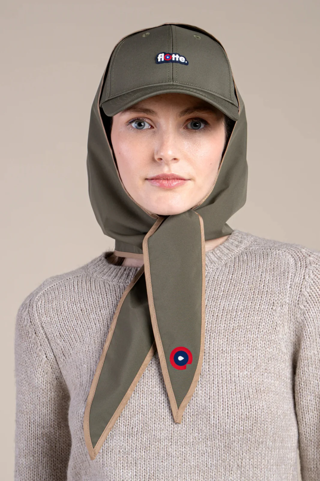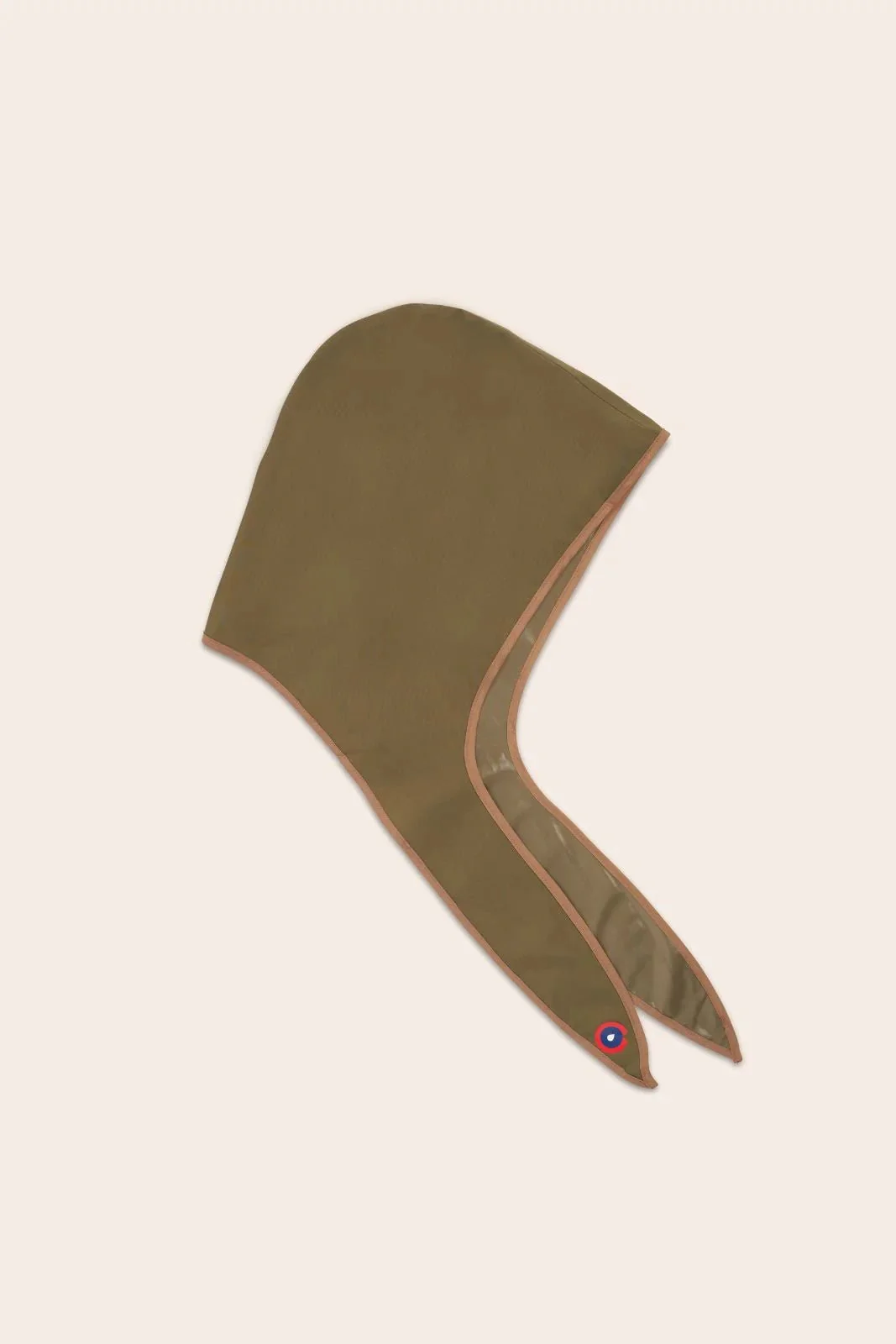 Couvre-chef, une capuche imperméable et nomade. Tissu en polyester recyclé et léger.