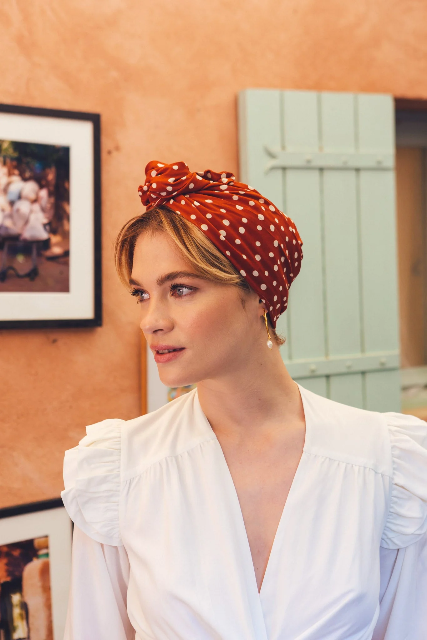 Ce turban terracotta à pois blancs apporte un charme rétro et plein de peps à votre style. Son imprimé à pois est une touche fun qui booste une tenue et capte l’attention.