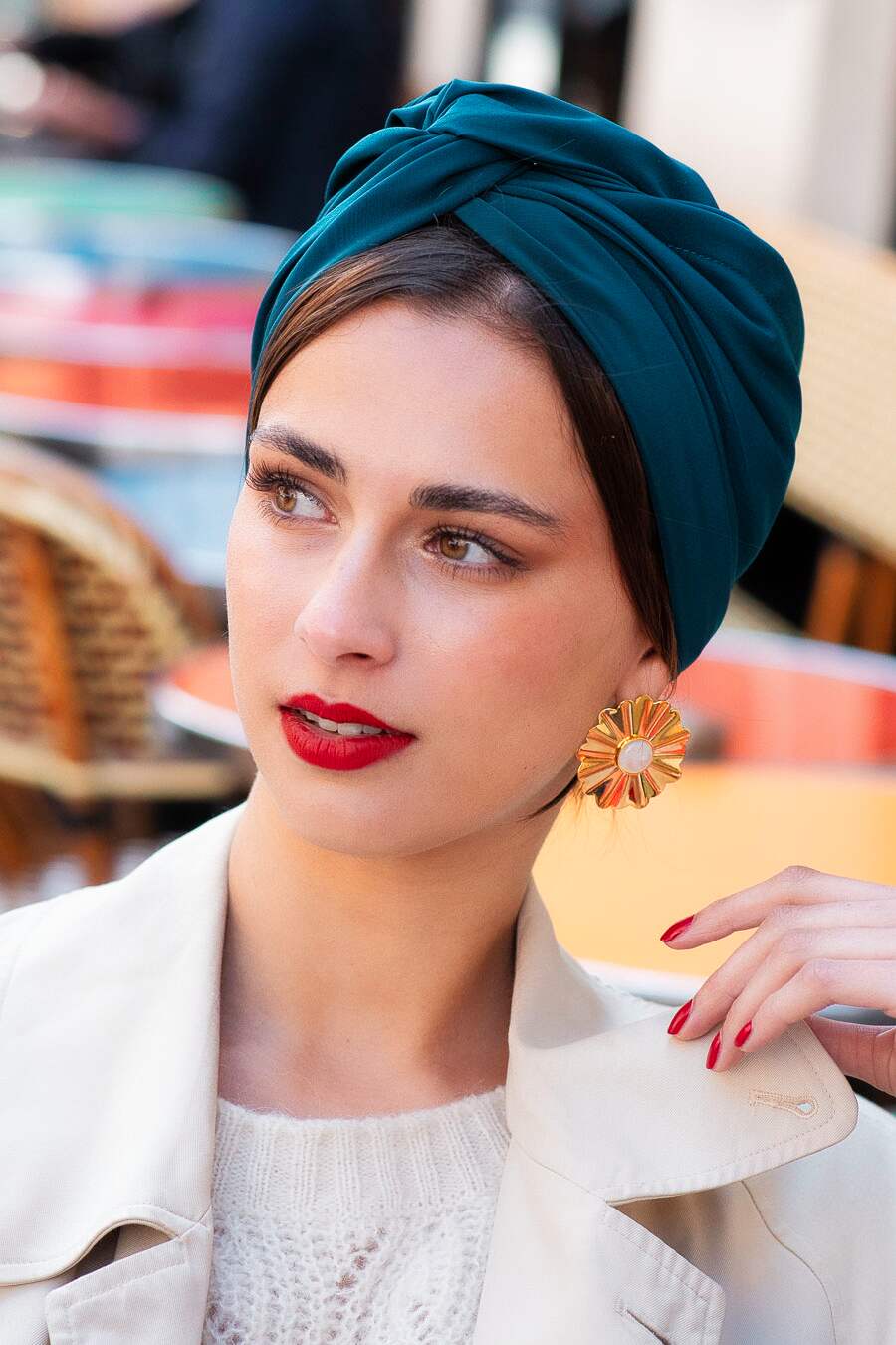 Avec sa couleur bleu canard profond, ce turban prêt à enfiler est un véritable atout pour ajouter une touche de sophistication et d’audace à votre tenue. Son coloris intense rehausse votre look tout en restant élégant.