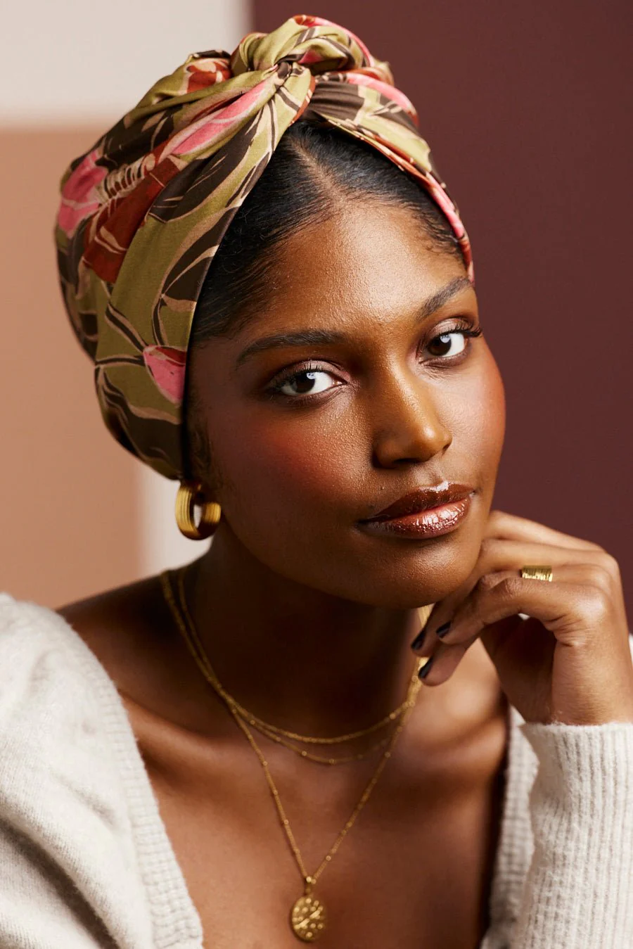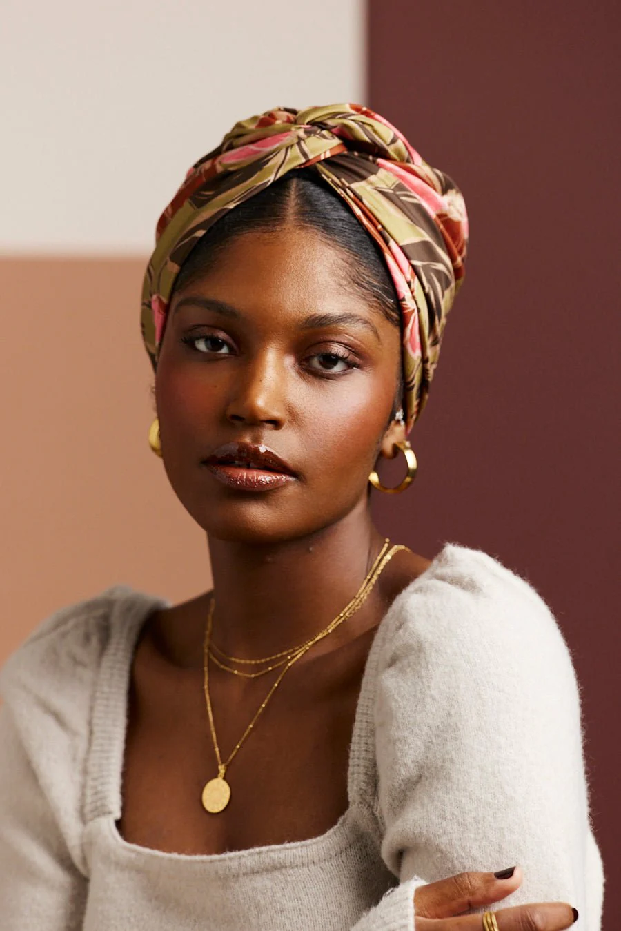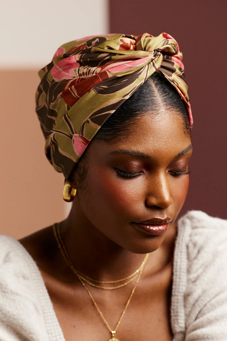 Turban facile à nouer imprimé floral vert kaki et rose