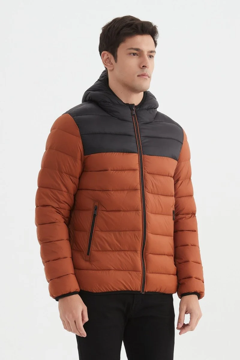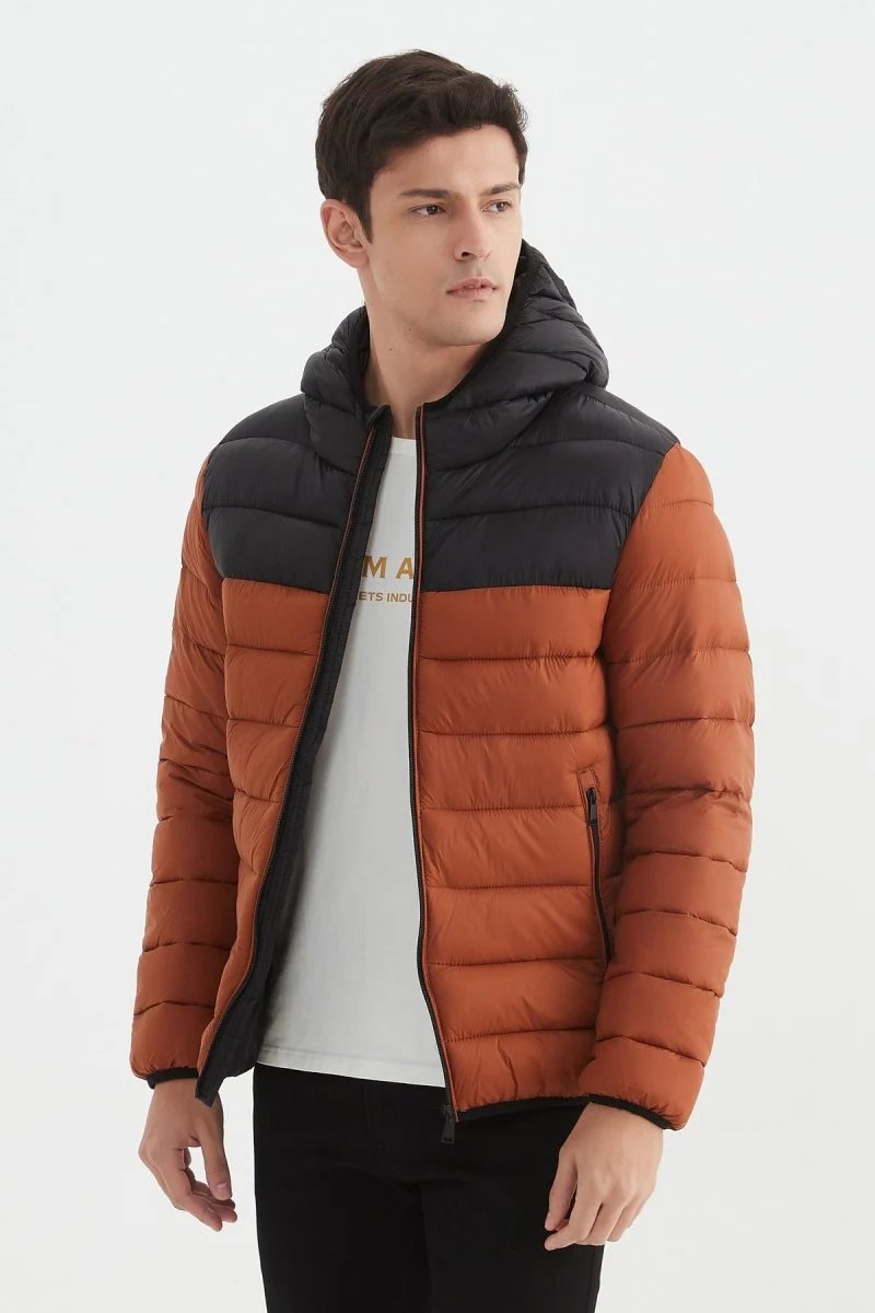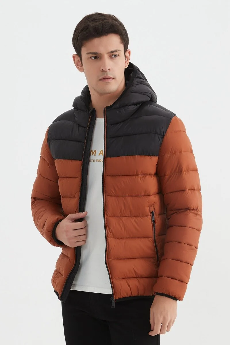 Doudoune légère mi-saison. Bicolore. Capuche fixe intégrée et col montant couvrant. Fermetures à glissière noires. 2 poches zippées sur les côtés. Doublure simple. 2 poches intérieures. Tissu déperlant « Technologie Water Repellent ». Piqûres en bandes moyennes.