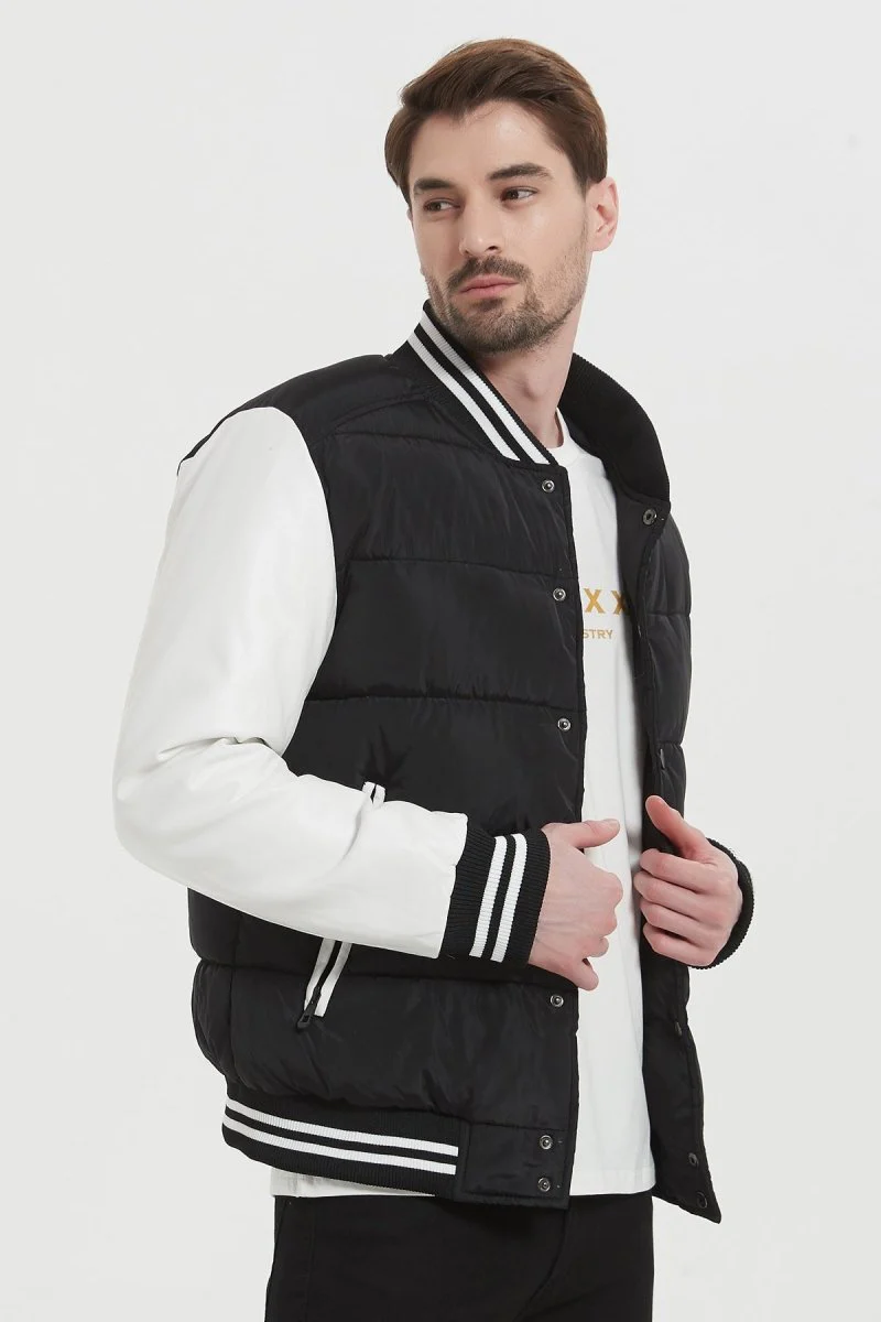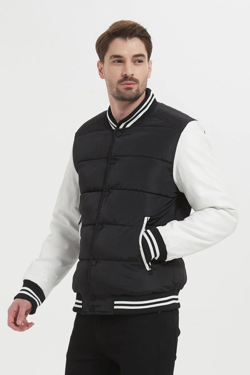 Bomber doudoune bouffant, Buste matelassé et manches contrastées, Col croisé à l’avant du modèle, Bord-côte à bandes au col, à la taille et aux poignets, Tissu déperlant « Water Repellent Technology », 2 poches zippées sur les côtés finitions blanches