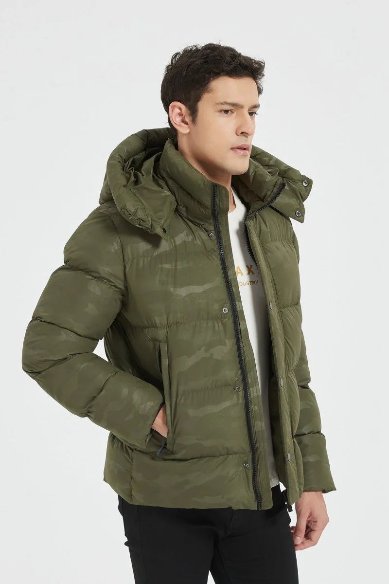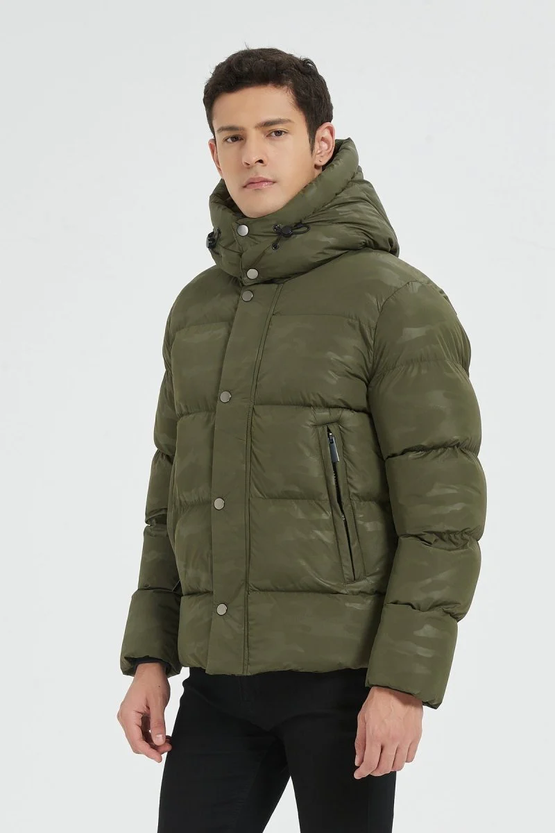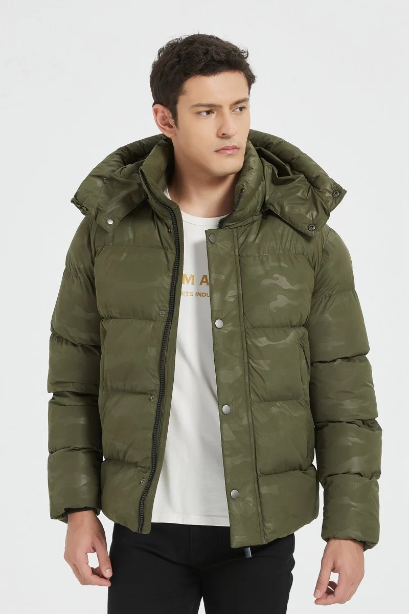 Doudoune d’hiver, aspect volumique gonflante. Matelassage en grandes bandes. Deux poches raglans. tissu uni ou camouflage. Fermeture à glissière sous rabat à bouton-pression cachés. Capuche amovible par zip. 2 poches zippées sur les côtés. 2 poche zippées intérieur.