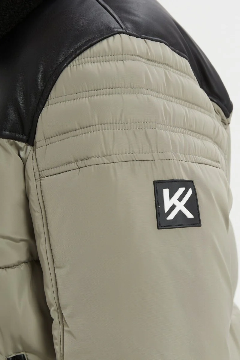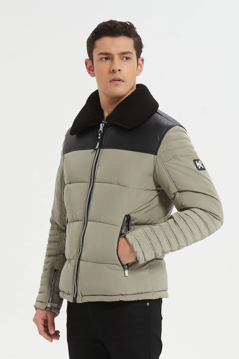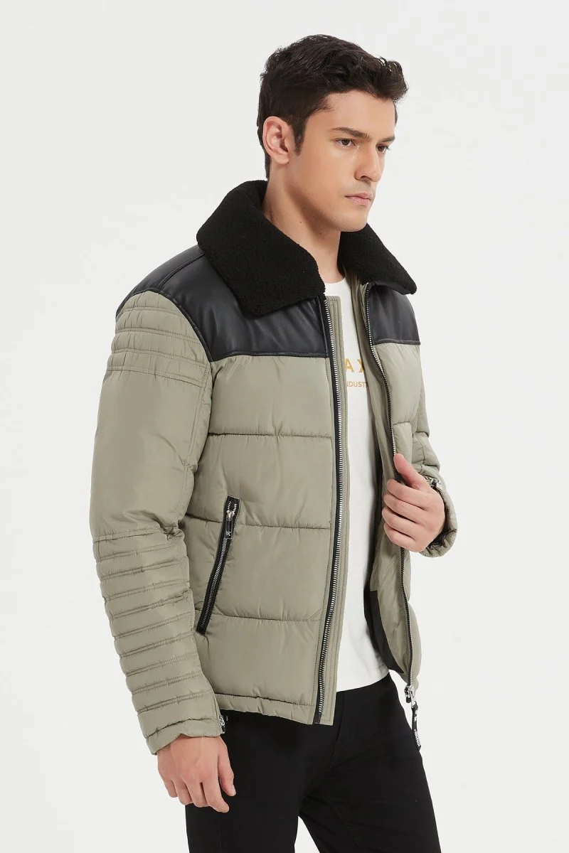 Doudoune avec col polaire. Deux poches zippées sur les côtés. Zip plastique effet métallique, tirette en métal. Empiècements sur les épaules. Matière simili-cuir au niveau des épaules. Une poche intérieur à zip. Doublure matelassée. Bande fine sur le bras avec une zip d’ajustement au manche.