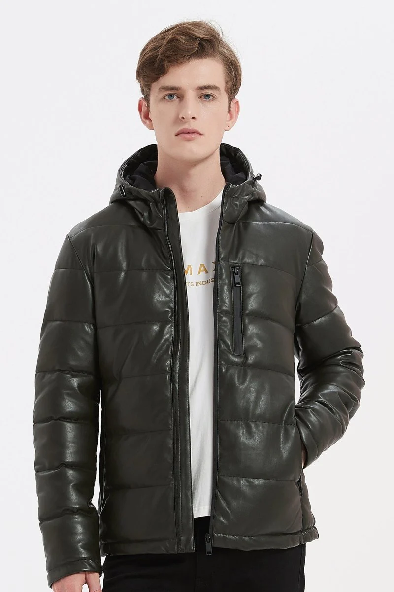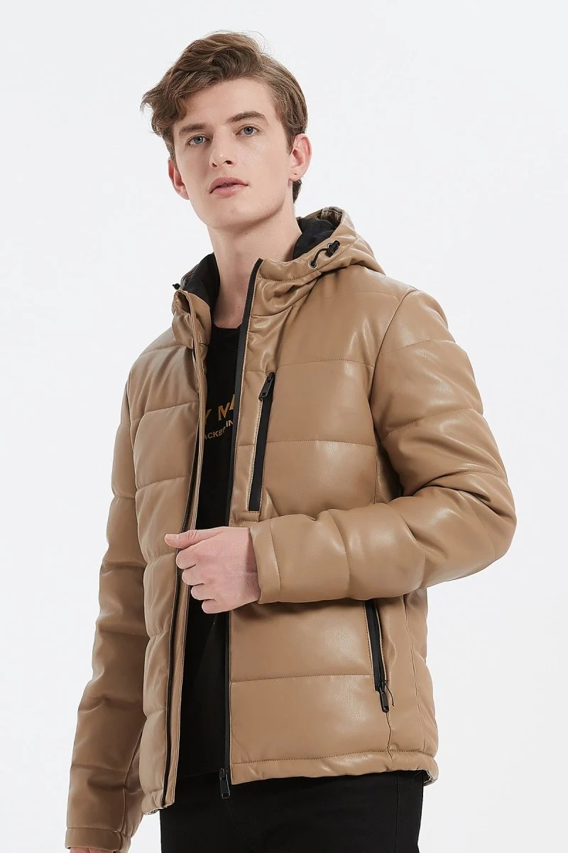 Doudoune manches longues. Tissu satiné effet simili cuir. Modèle d’hiver bien chaud. Matière déperlante « Technology Water Repellent ». Capuche intégrée avec cordon de serrage. 2 poches zippées sur les côtés. Poche zippée sur la poitrine.