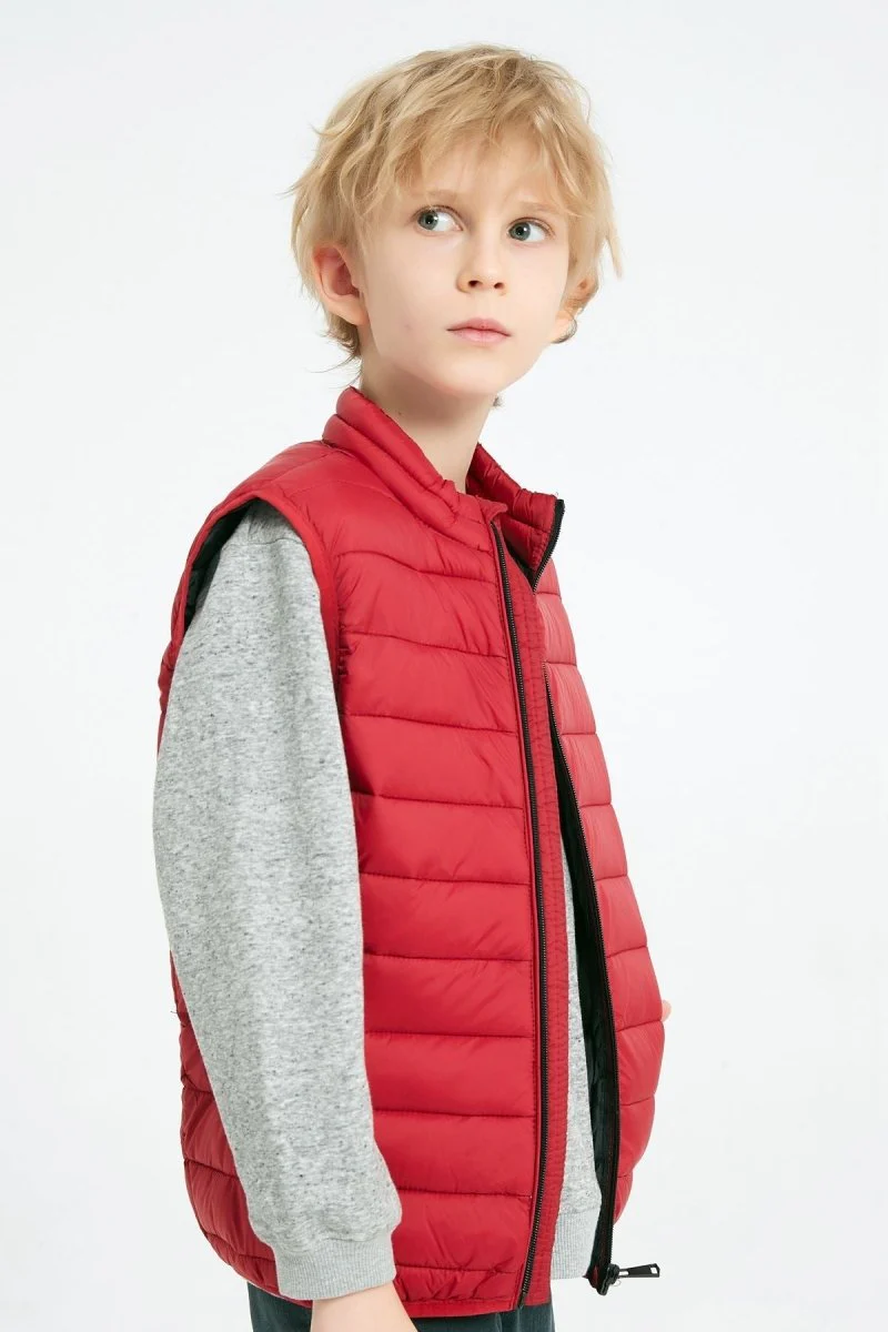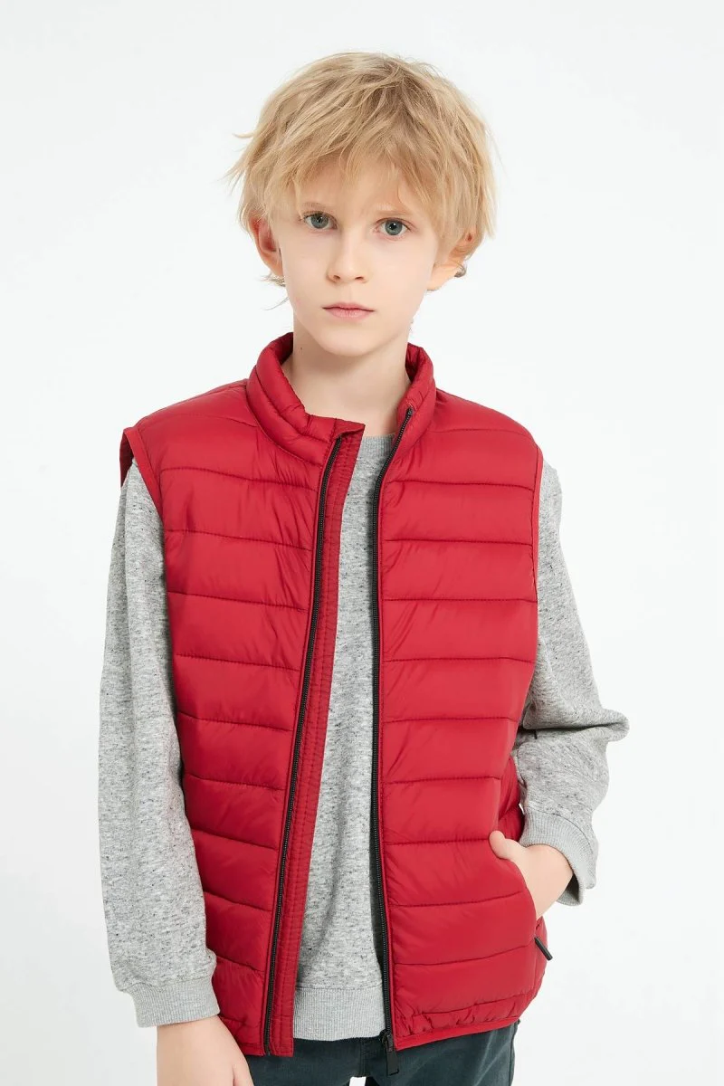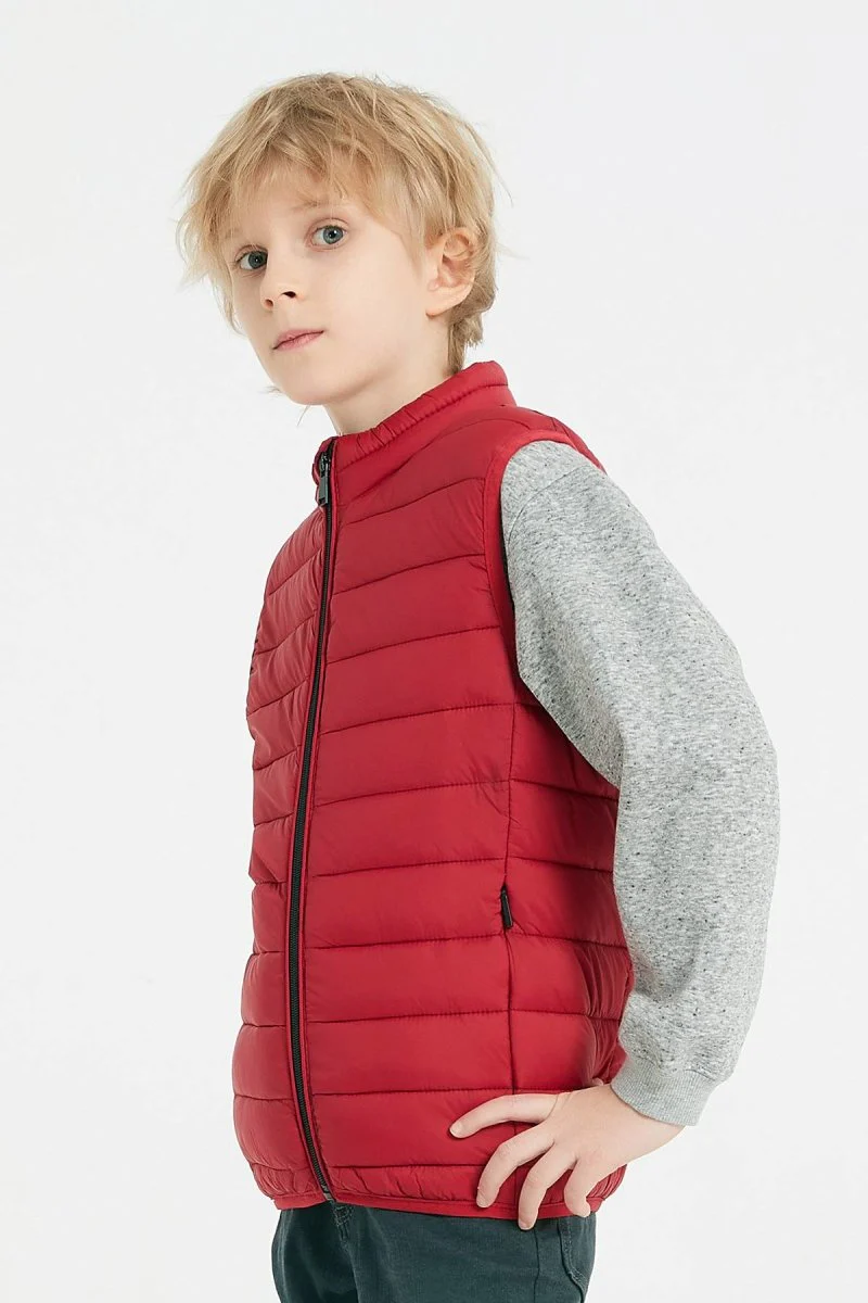 Doudoune enfant sans manches, modèle mi-saison léger et compact, Coupe courte ajustée, Col montant couvrant, Piqûres en bandes moyennes, Tissu déperlant « Technology Water Repellent », Fermeture à glissière contrastée, 2 poches zippées invisibles sur les côtés, Doublure assortie avec poche intérieure.