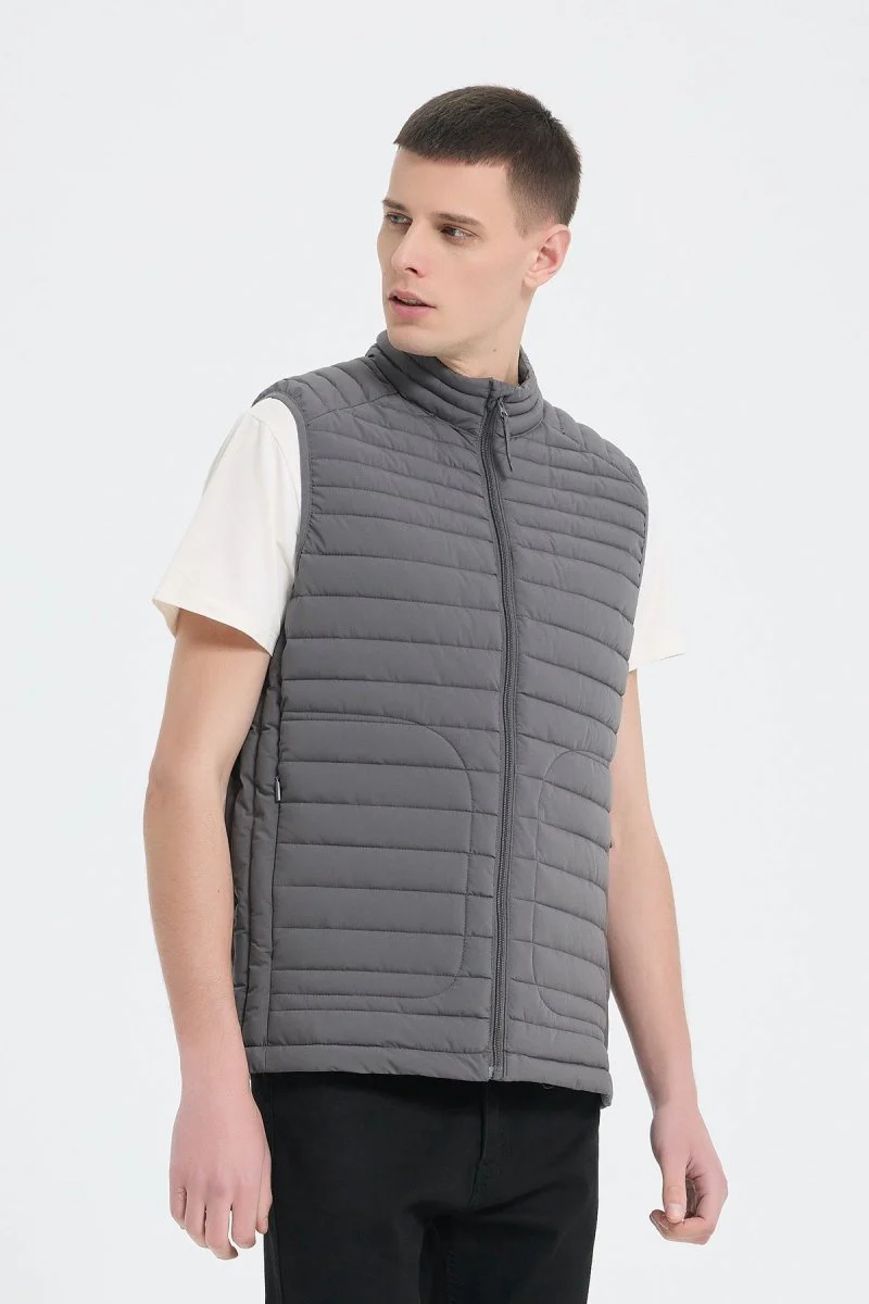 Doudoune sans manches, modèle mi-saison léger et compact, Coupe droite, Col montant couvrant, Piqûres en bandes fines, Tissu déperlant « Technology Water Repellent », 2 poches zippées sur les côtés, Doublure assortie avec 2 poche intérieure au niveau du ventre, fermeture éclair de matière plastique.
