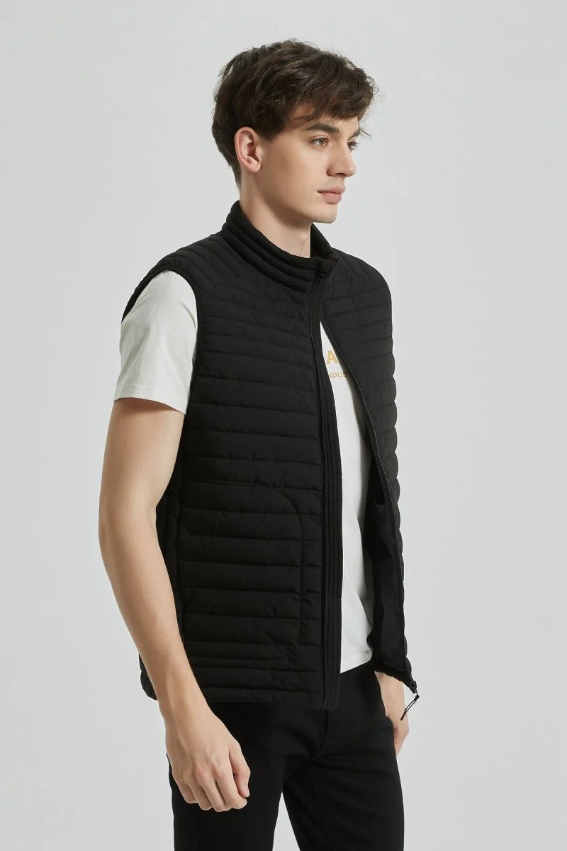 Doudoune sans manches, modèle mi-saison léger et compact, Coupe droite, Col montant couvrant, Piqûres en bandes fines, Tissu déperlant « Technology Water Repellent », 2 poches zippées sur les côtés, Doublure assortie avec 2 poche intérieure au niveau du ventre, fermeture éclair de matière plastique.