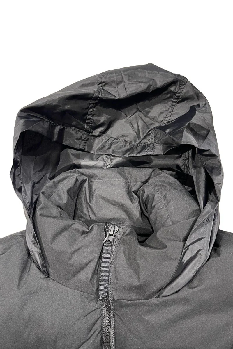 Doudoune oversize. Modèle d’hiver bien chaud. Col montant avec capuche fine intégrée. Tissu imprimé teinture matelassé en bandes larges. Matière déperlante « Technology Water Repellent ». Fermeture à glissière avec tirette en caoutchouc. Poignets à scratche. Doublure simple avec une poche intérieur à scratch.