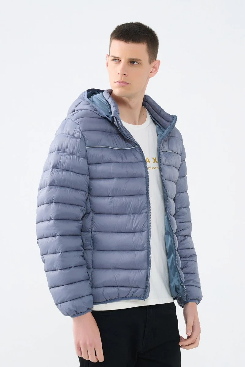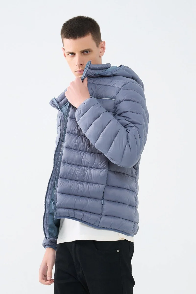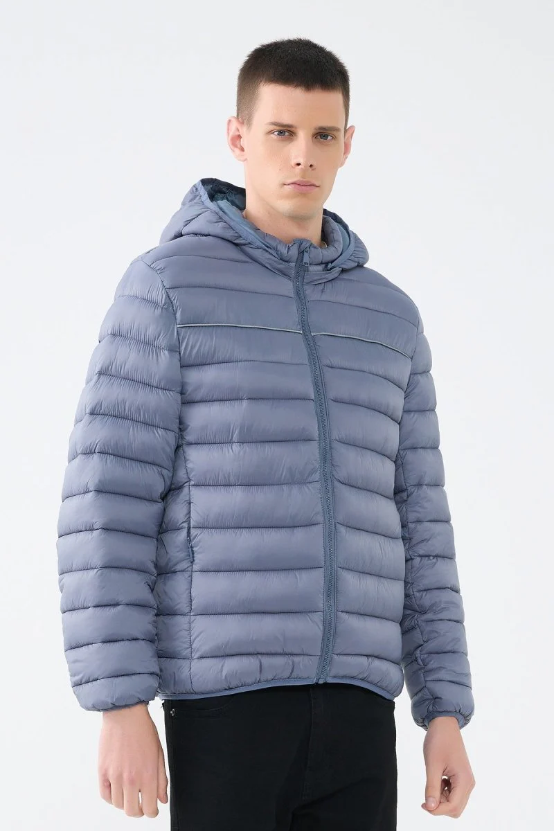 Doudoune légère manches longues. Capuche amovible. Bande moyenne. Sans doublure avec deux poches intérieurs. Trait gris réfléchissante sur la torse.