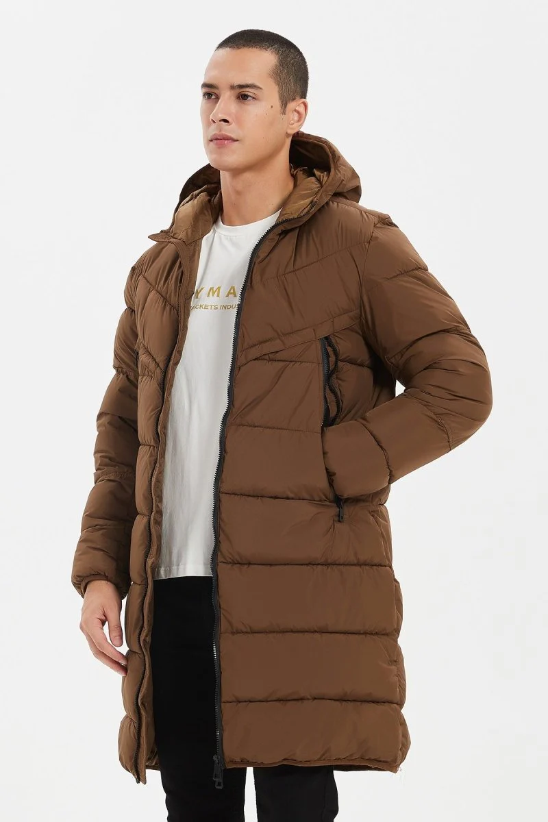 Doudoune longue bouffante. Avec capuche. Version longue de la doudoune BASTIEN. 2 poches verticales très larges. Matelassage en bandes avec 2 directions différentes : le haut est en latéral, le bas en horizontal. Les 2 directions de bandes créées une coupure, ajoutant du caractère à la doudoune. Fermeture éclair.