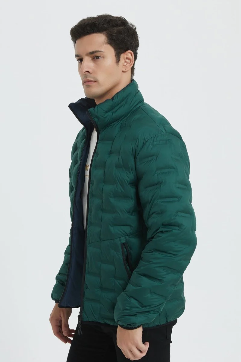Doudoune réversible. Doublure simple. Col montant. Fermetures à glissière noires spécial double face. 2 poches zippées sur les côtés. Matière déperlante « Technology Water Repellent ».