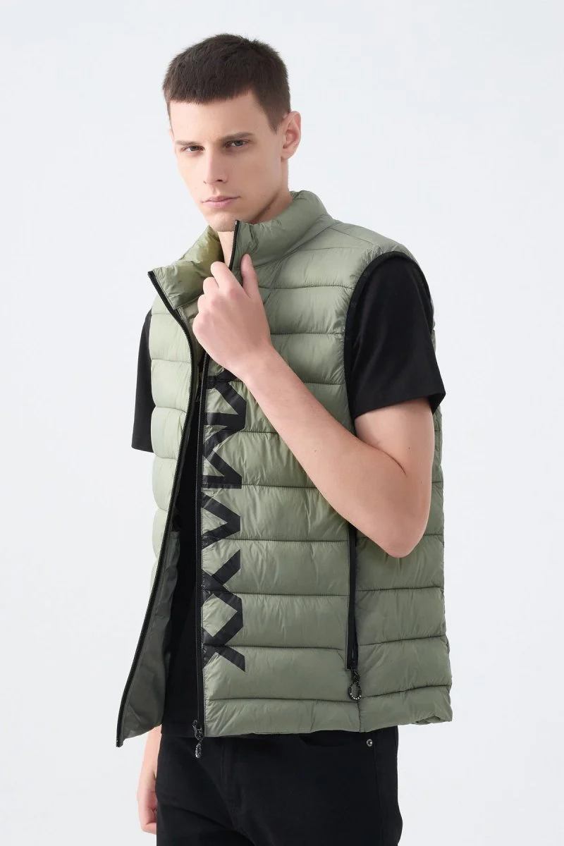 Doudoune sans manches, modèle mi-saison léger et compact, Coupe droite, Col montant couvrant, Piqûres en bandes moyennes, Tissu déperlant « Technology Water Repellent », 2 poches zippées sur les côtés, Doublure assortie avec 3 poches intérieure dont une à fermeture éclair, Fermeture éclair de matière plastique, Logotype KYMAXX sur les tirettes, les ourlets et sur le zip central.