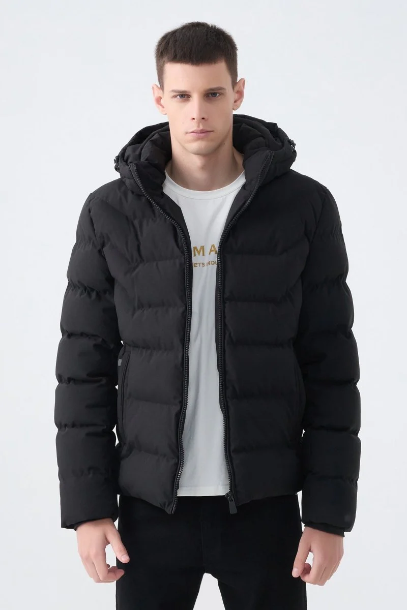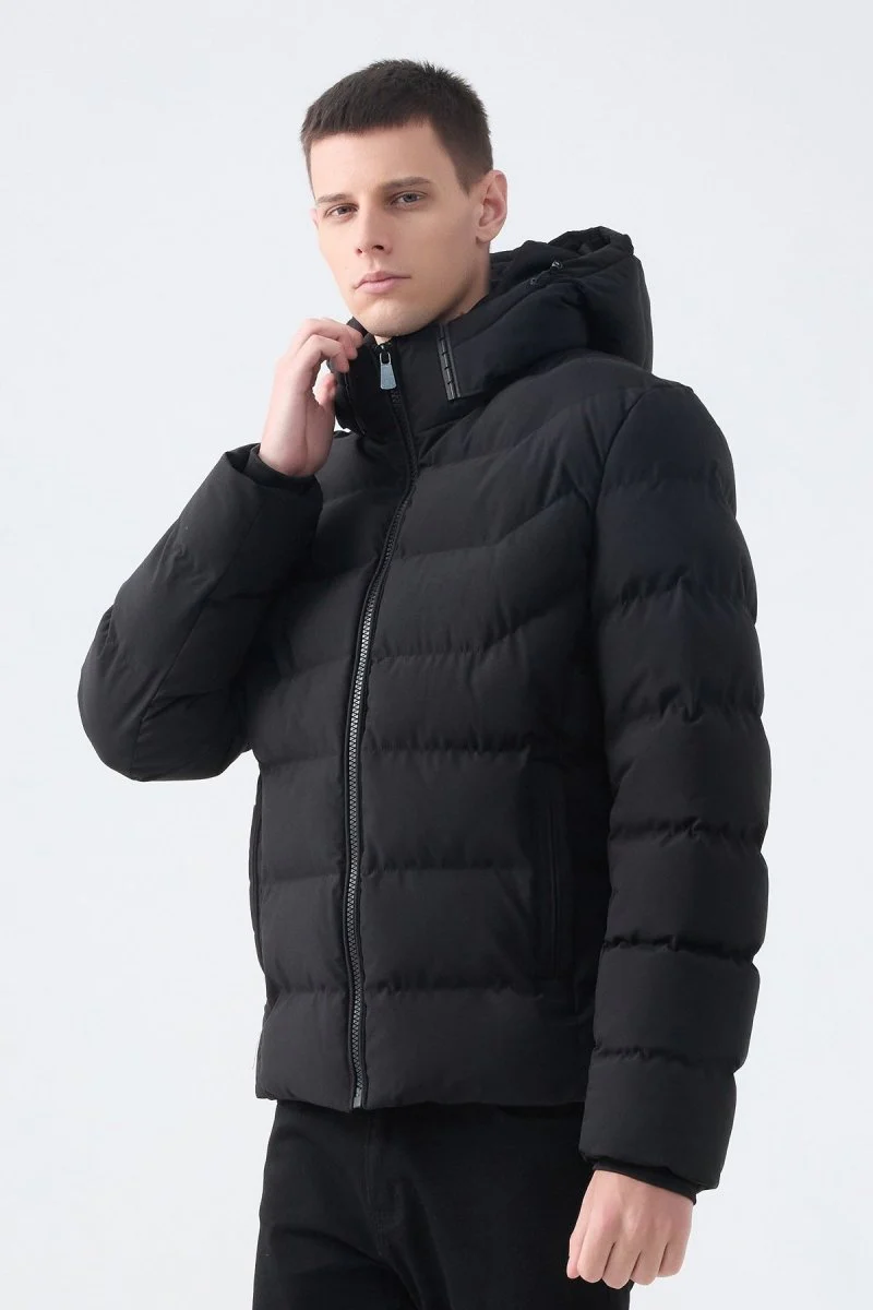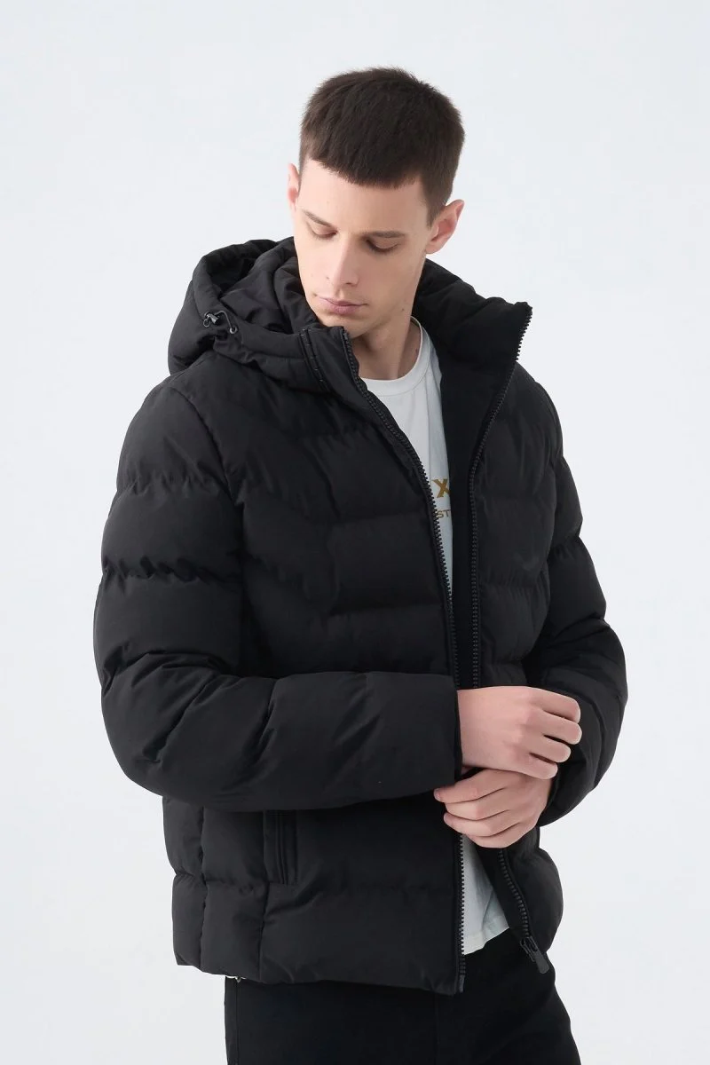 Doudoune piqûres en bandes moyennes. 2 poches zippées raglans sur les côtés. 1 poche à l’intérieur. Capuche amovible à zip. Tissu déperlant « Water Repellent Technology ». Doublure simple. Point intérieur avec serrage élastique.