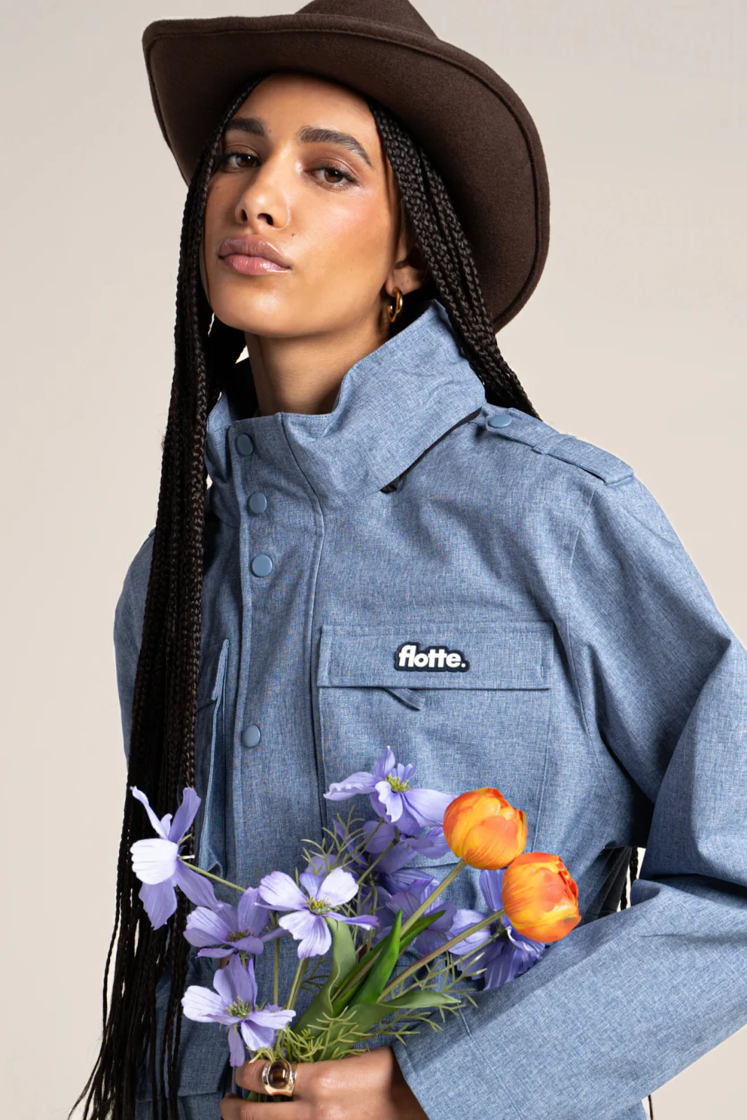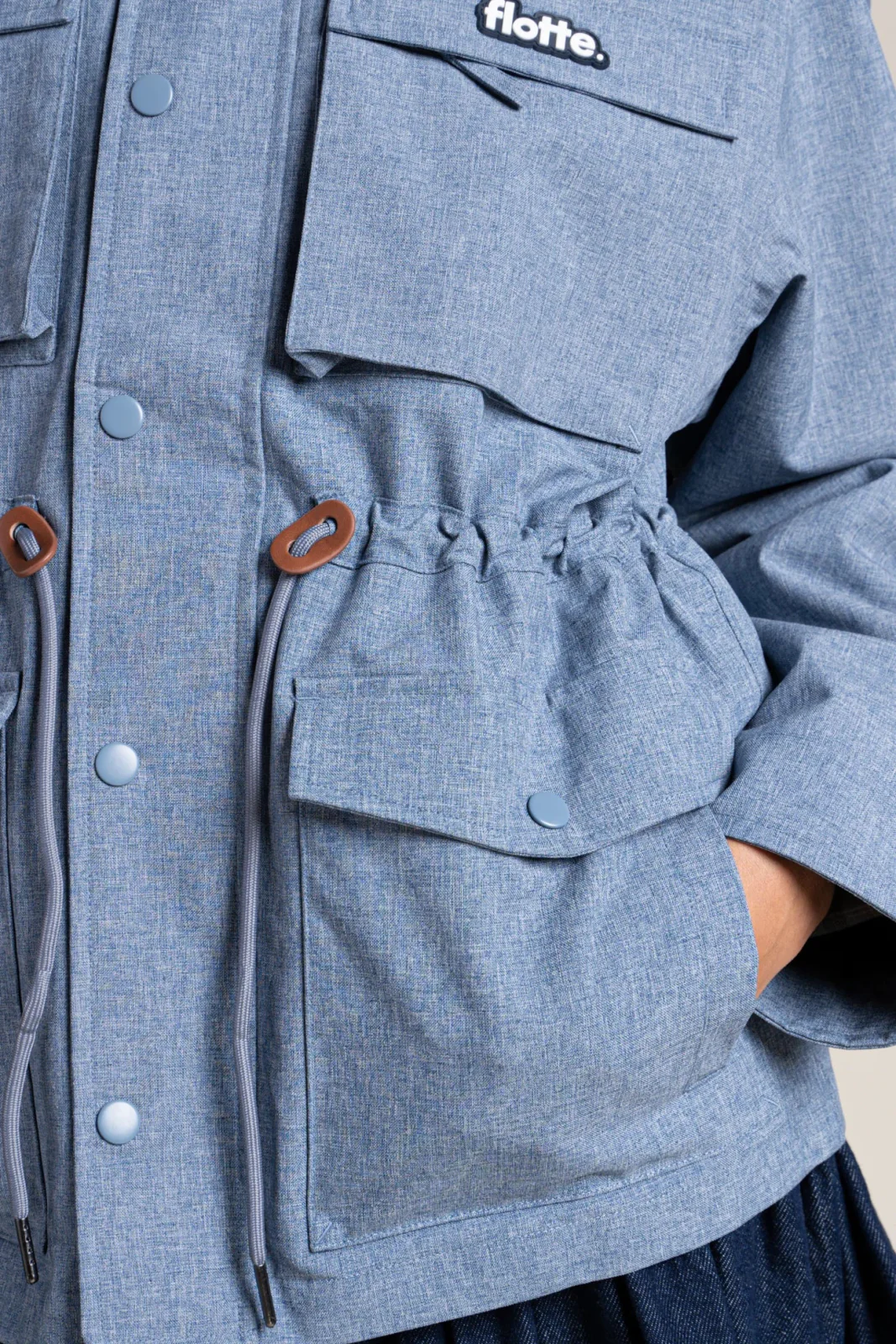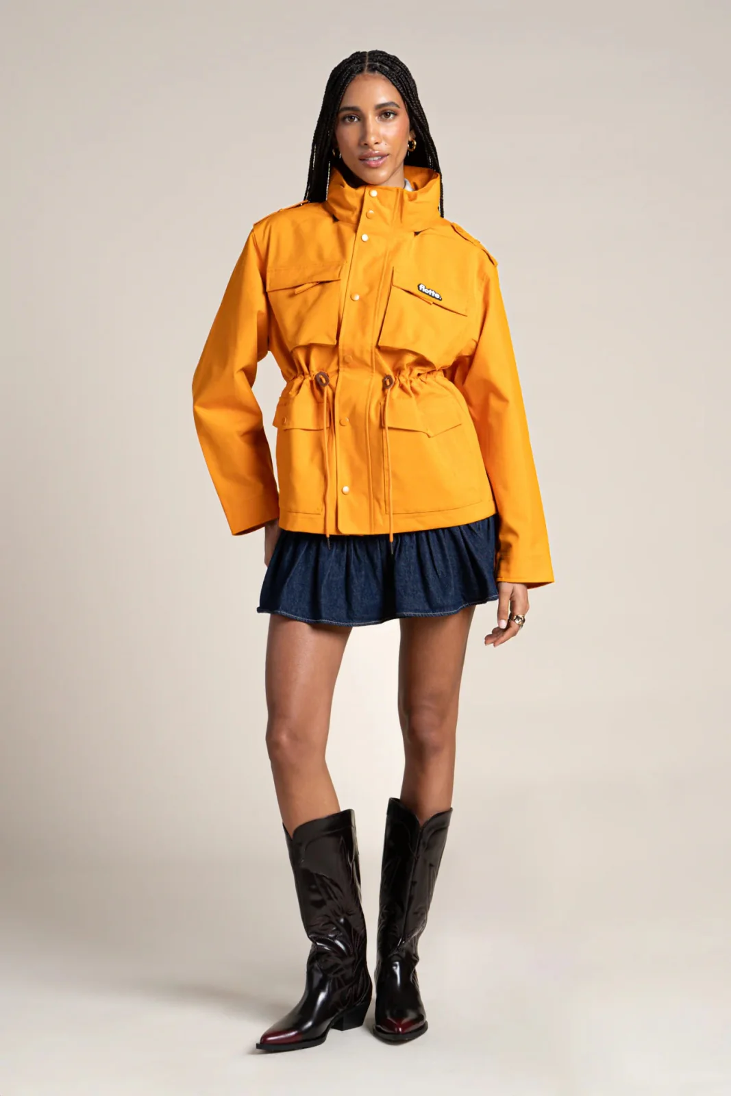 Veste saharienne. Imperméable et coupe-vent. Tissu en polyester recyclé. Capuche dissimulée dans le col. Resserrée à la taille.