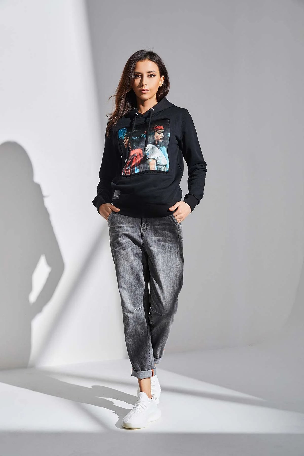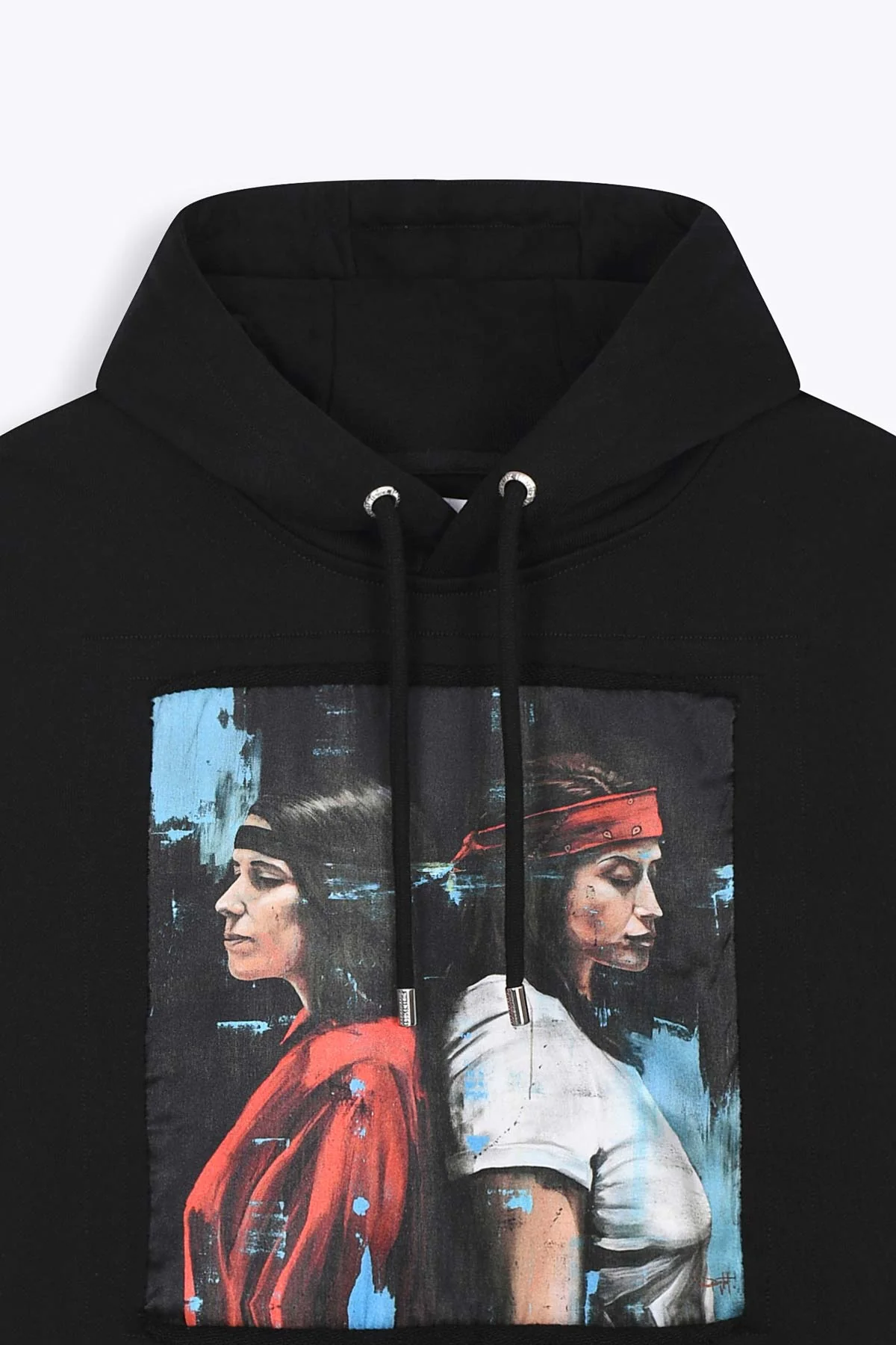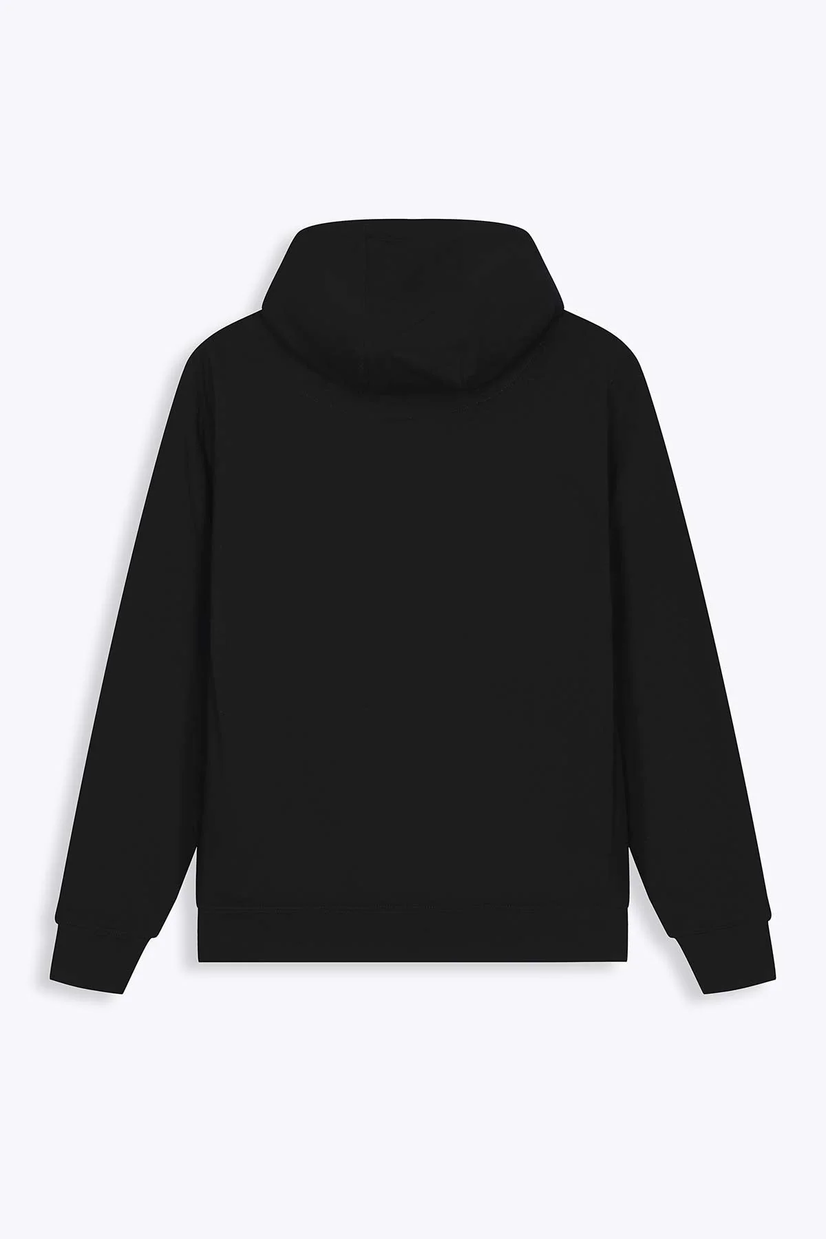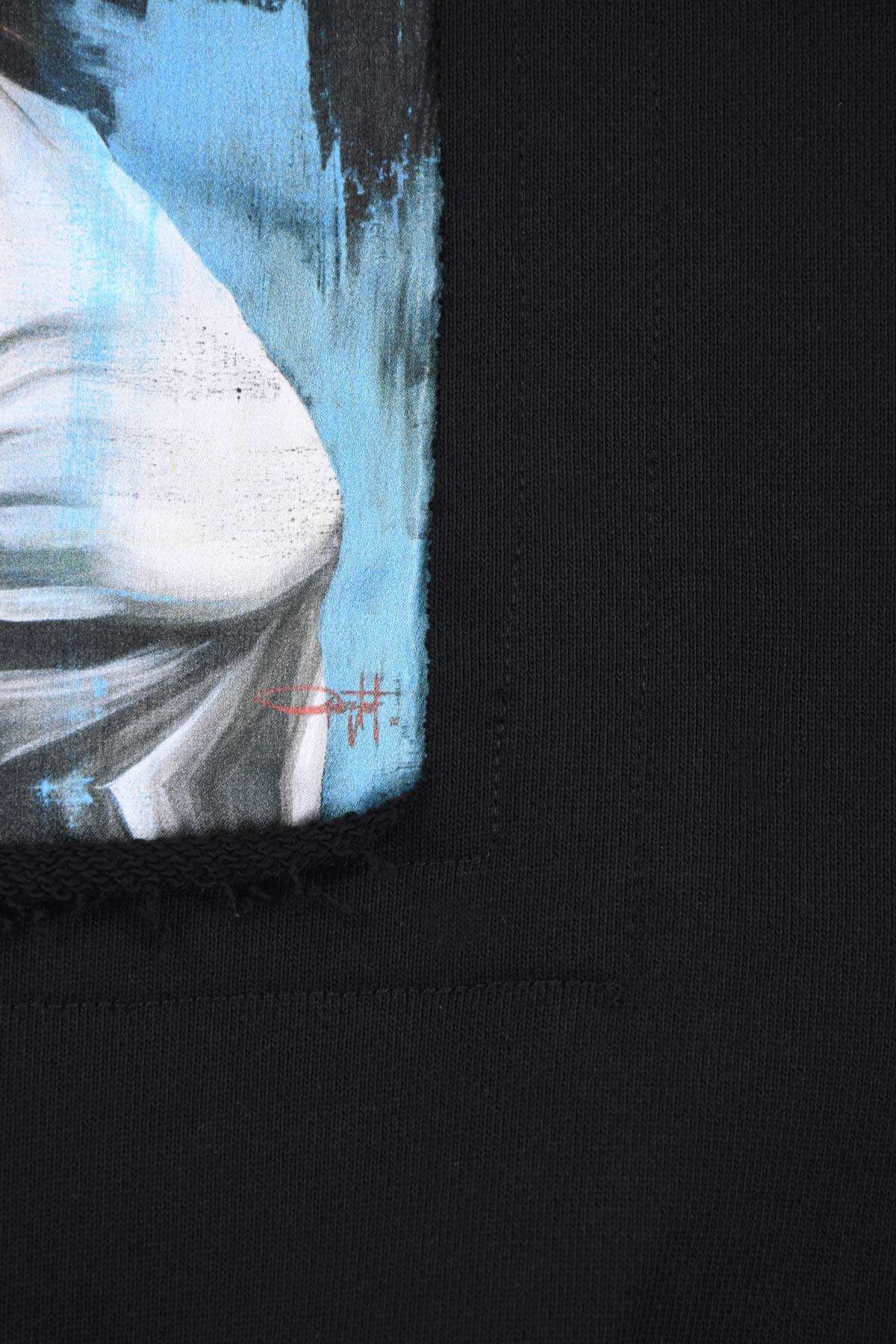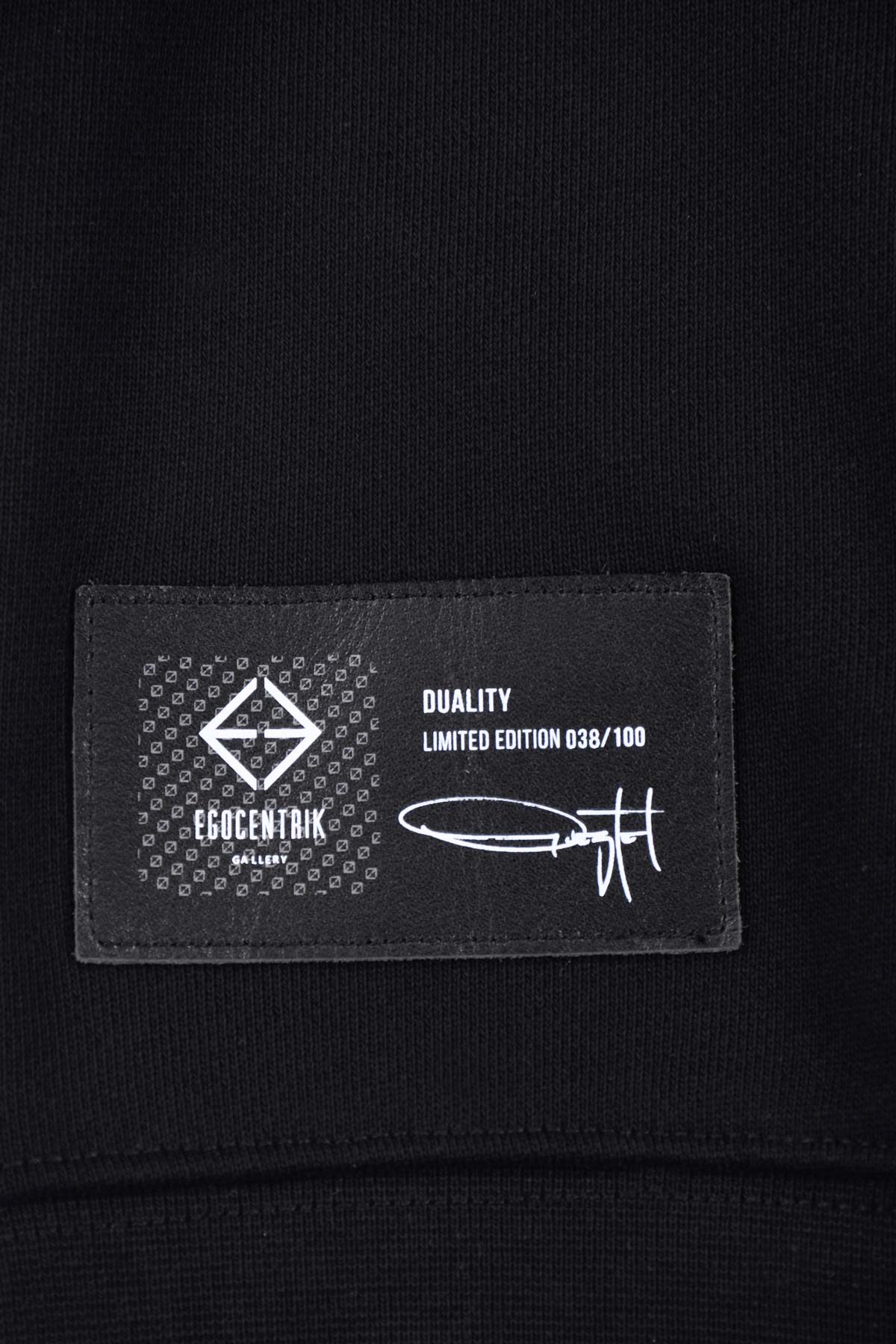 Ce Sweat à capuche de couleur noir, doté de manches longues et de poignets côtelés, est sublimé par un empiècement de soie de l’oeuvre « Duality » de l’artiste Français : Mathieu Questel 100% soie. Ce visuel cousu ingénieusement dans l’intérieur de la matière à la façon d’un cadre de tableau donne une esthétique originale et travaillée.