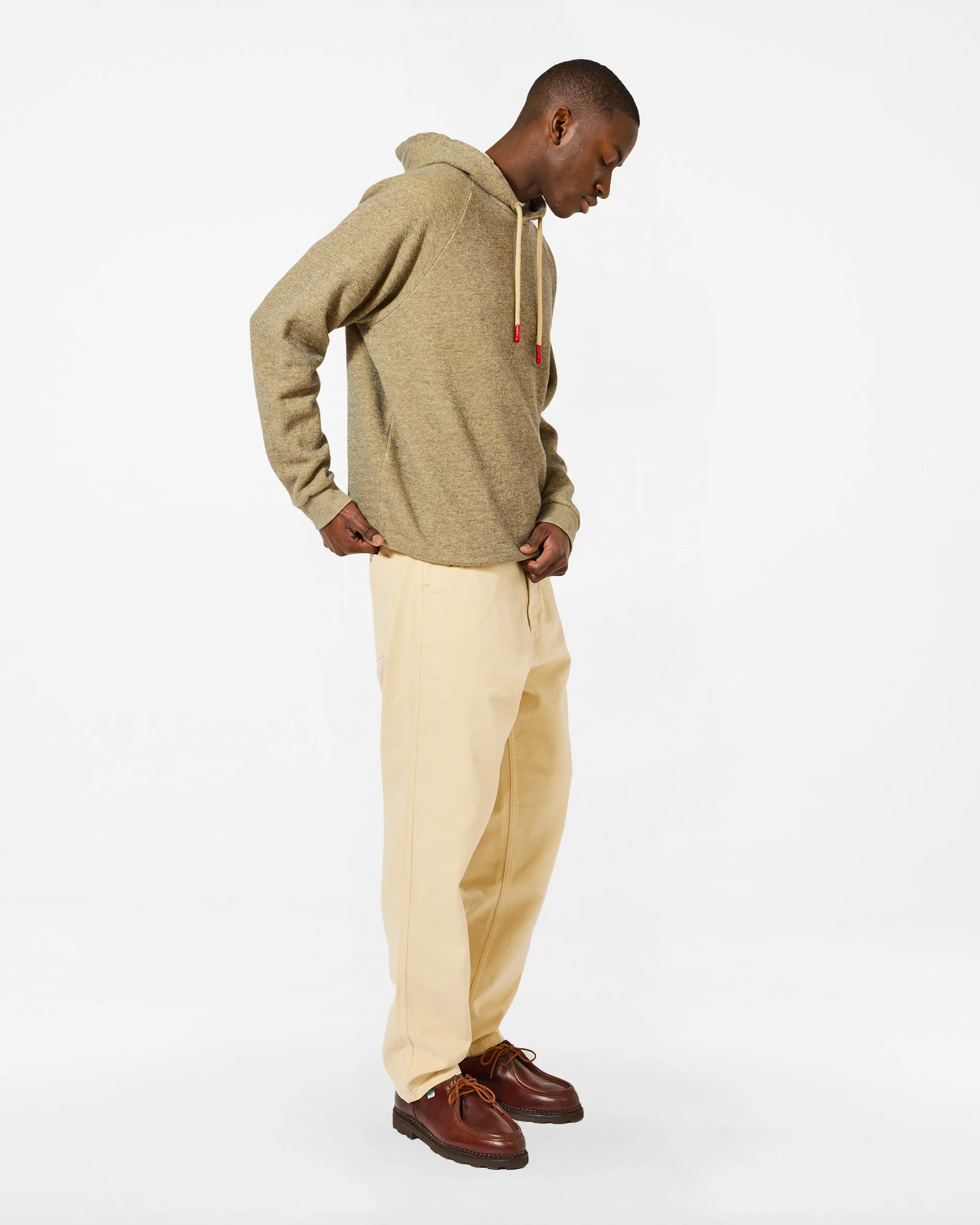 Sa coupe régulière et ses manches raglan garantissent une liberté de mouvement optimale, tandis que les finitions côtelées aux poignets et à l’ourlet ajoutent une touche de finition soignée. Les cordons de serrage en coton ton sur ton sont agrémentés d’embouts en résine rouge pour un détail subtil mais distinctif.