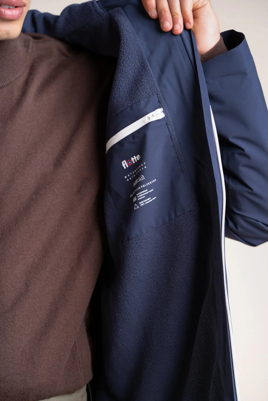 Une parka imperméable, courte et doublée en polaire. Tissu en polyester recyclé. Poche intérieure. Fermeture éclair à double-curseur.