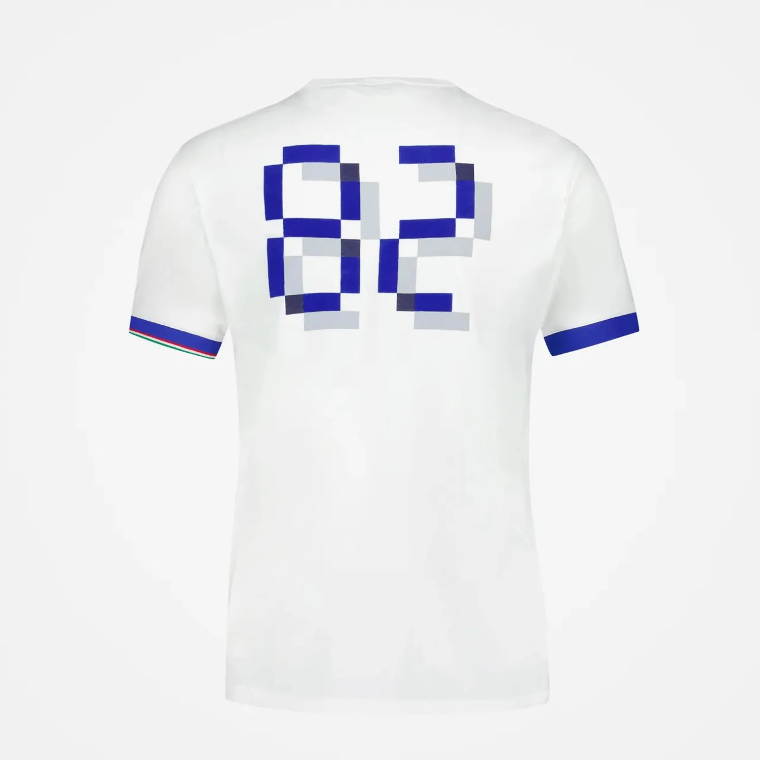 Badge silicone « 1982 » réinterprétant le logo original Italie 82 avec les couleurs de l’Italie et le logo du club Velasca appliqué sur la poitrine côté gauche au porté, « Logo du Coq » floqué sur la poitrine côté droit au porté, numéro « 82 » milieu devant mélangeant sérigraphie et floque – Tricoté et teint en France – Confectionné au Maroc
