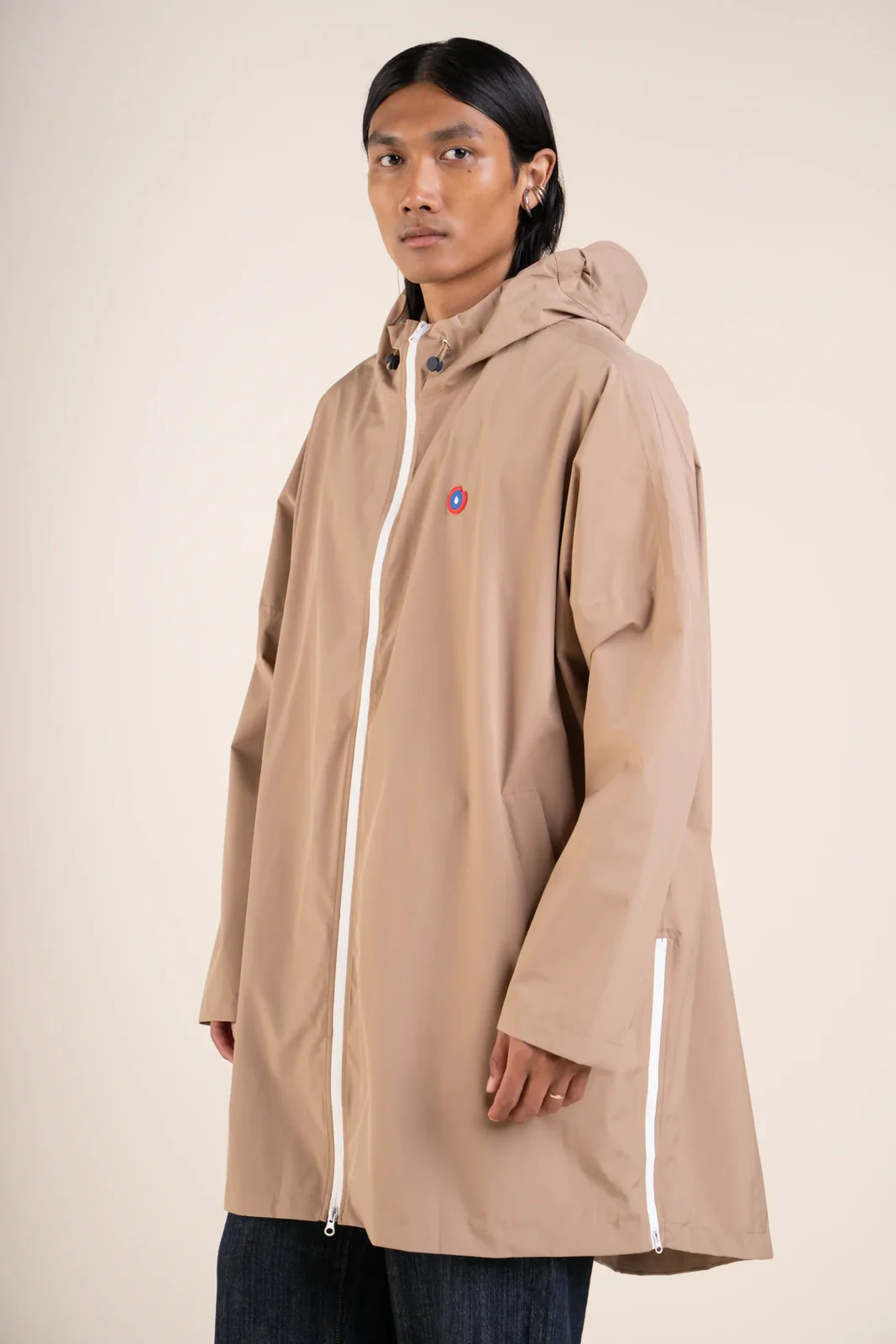 Une cape de pluie imperméable. Tissu en polyester recyclé, respirant et léger. Capuche à visière ajustable, fentes zippées. Pratique et modulable en sac.