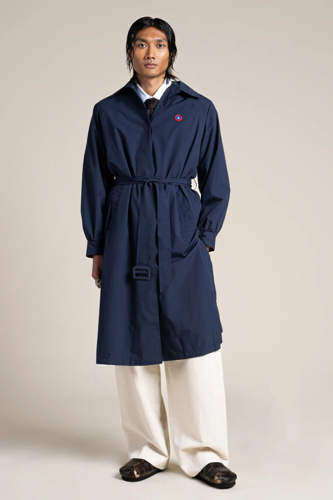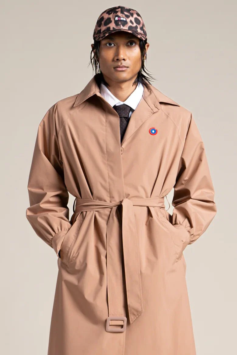 Un trenchcoat imperméable. Tissu en polyester recyclé, respirant et léger. Ceinture amovible.