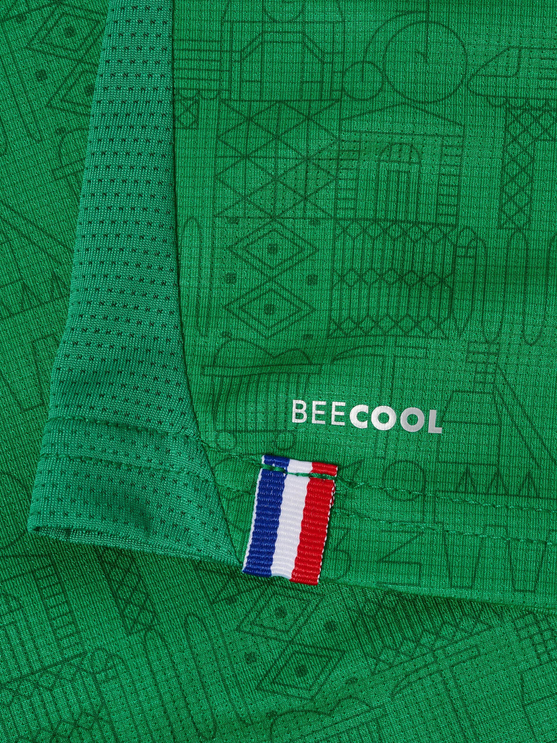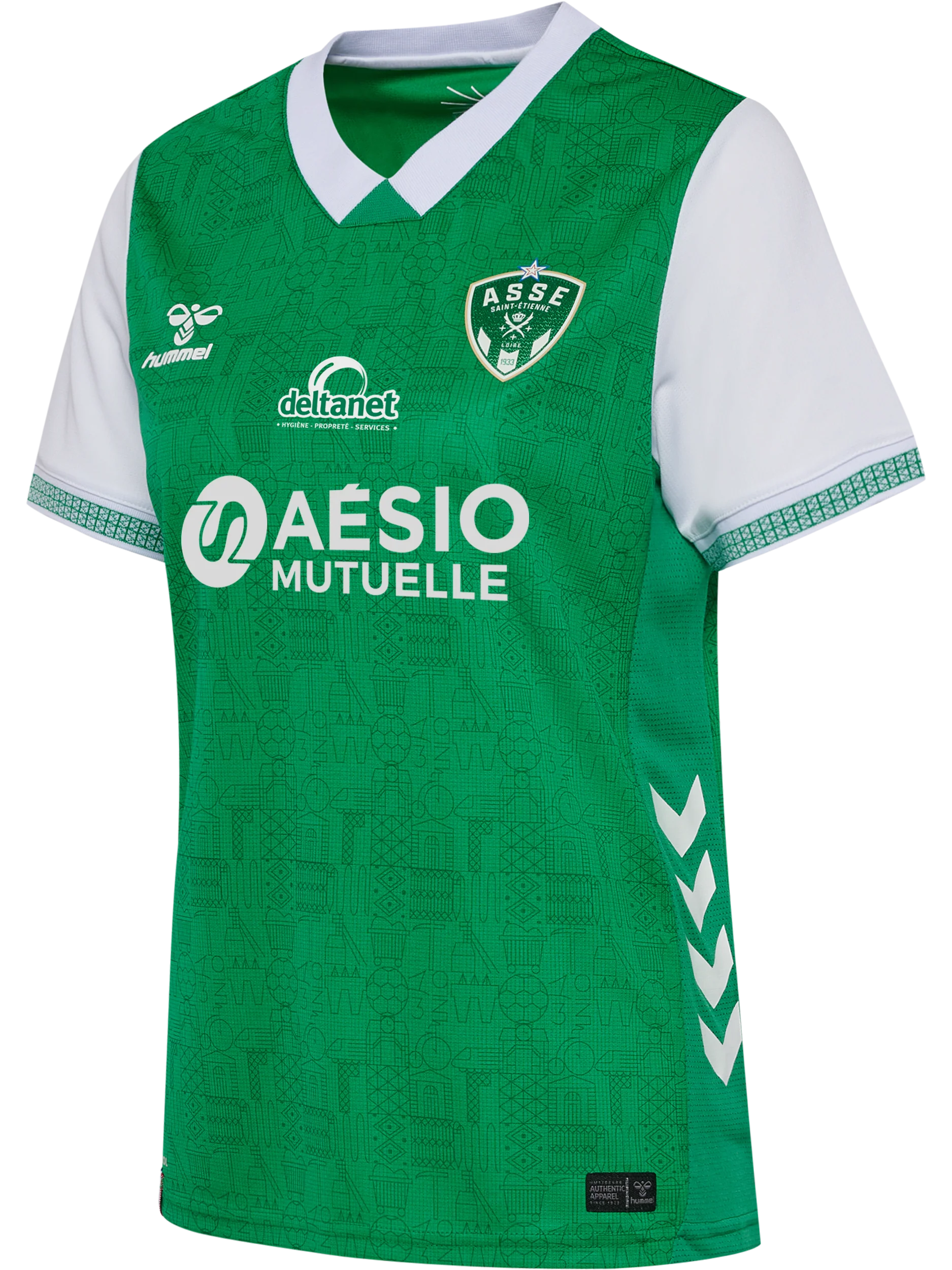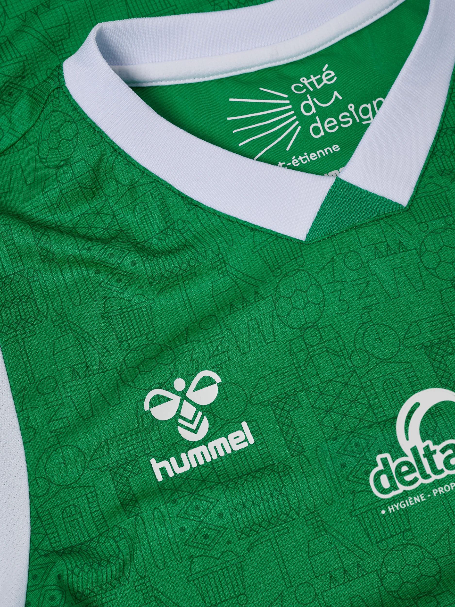 Ce maillot porte aussi une nouveauté forte : les manches blanches. Au-delà de la lumière et de la touche de modernité qu’elles apportent, elles arborent les motifs architecturaux de la Platine, bâtiment emblématique de la Cité du design, transformés ici en un lien entre histoire et création par un ruban graphique.