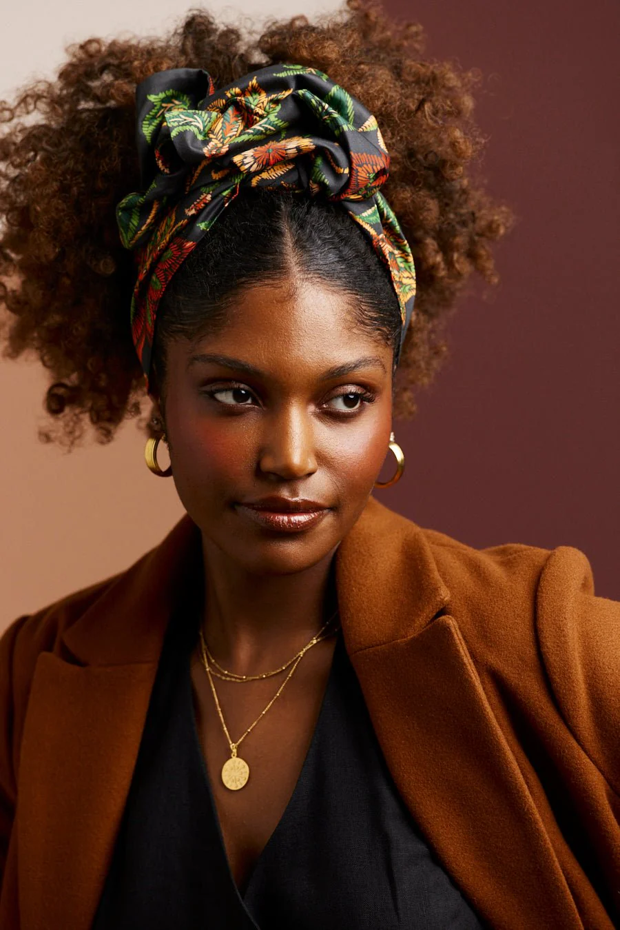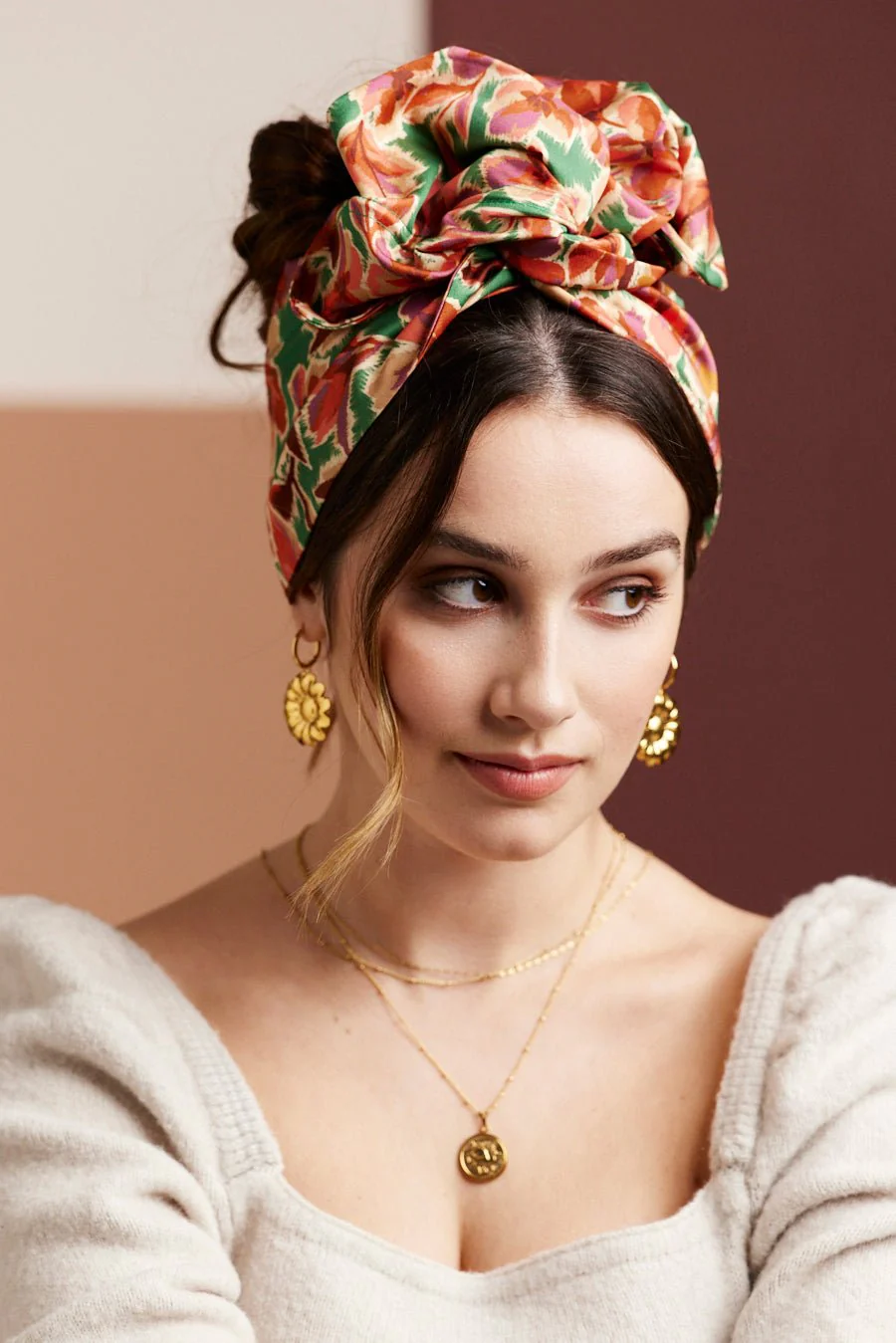 BANDEAU CHEVEUX À TIGES METALLIQUES imprimé automnale vert et corail